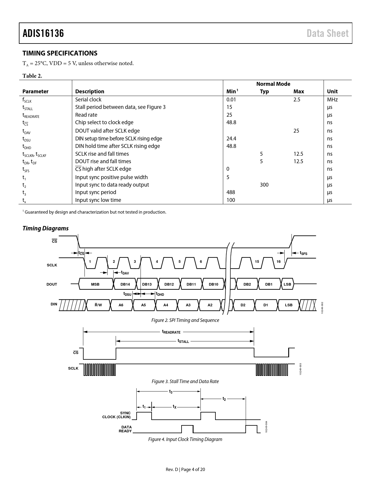 link to page 5 link to page 7 link to page 5 ADIS16136Data SheetTIMING SPECIFICATIONS TA = 25°C, VDD = 5 V, unless otherwise noted. Table 2.Normal ModeParameterDescriptionMin1TypMaxUnit f Serial clock 0.01 2.5 MHz SCLK t Stall period between data, see Figure 3 15 µs STALL t Read rate 25 µs READRATE t Chip select to clock edge 48.8 ns CS t DOUT valid after SCLK edge 25 ns DAV t DIN setup time before SCLK rising edge 24.4 ns DSU t DIN hold time after SCLK rising edge 48.8 ns DHD t , t SCLK rise and fall times 5 12.5 ns SCLKR SCLKF t , t DOUT rise and fall times 5 12.5 ns DR DF t SFS CS high after SCLK edge 0 ns t Input sync positive pulse width 5 µs 1 t Input sync to data ready output 300 µs 2 t Input sync period 488 µs 3 t Input sync low time 100 µs x 1 Guaranteed by design and characterization but not tested in production. Timing DiagramsCStCStSFS1234561516SCLKtDAVDOUTMSBDB14DB13DB12DB11DB10DB2DB1LSBttDSUDHDDINR/WA6A5A4A3A2D2D1LSB 002 10249- Figure 2. SPI Timing and Sequence tREADRATEtSTALLCS 003 SCLK 10249- Figure 3. Stall Time and Data Rate t3t2tt1XSYNCCLOCK (CLKIN) 004 DATAREADY 10249- Figure 4. Input Clock Timing Diagram Rev. D | Page 4 of 20 Document Outline FEATURES APPLICATIONS GENERAL DESCRIPTION FUNCTIONAL BLOCK DIAGRAM TABLE OF CONTENTS REVISION HISTORY SPECIFICATIONS TIMING SPECIFICATIONS Timing Diagrams ABSOLUTE MAXIMUM RATINGS ESD CAUTION PIN CONFIGURATION AND FUNCTION DESCRIPTIONS TYPICAL PERFORMANCE CHARACTERISTICS THEORY OF OPERATION READING SENSOR DATA OUTPUT DATA REGISTERS Rotation Rate (Gyroscope) Internal Temperature DEVICE CONFIGURATION Dual Memory Structure USER REGISTERS DIGITAL PROCESSING CONFIGURATION INTERNAL SAMPLE RATE INPUT CLOCK CONFIGURATION DIGITAL FILTERING AVERAGING/DECIMATION FILTER CALIBRATION AUTOMATIC BIAS CORRECTION (AUTONULL) MANUAL BIAS CORRECTION Restoring Factory Calibration ALARMS STATIC ALARM USE DYNAMIC ALARM USE ALARM REPORTING Alarm Example SYSTEM CONTROLS GLOBAL COMMANDS Software Reset MEMORY MANAGEMENT Checksum Test GENERAL-PURPOSE INPUT/OUTPUT Data Ready Input/Output Indicator Example Input/Output Configuration AUTOMATIC SELF TEST POWER MANAGEMENT STATUS PRODUCT IDENTIFICATION APPLICATIONS INFORMATION POWER SUPPLY CONSIDERATIONS PROTOTYPE INTERFACE BOARD INSTALLATION TIPS PACKAGING AND ORDERING INFORMATION OUTLINE DIMENSIONS ORDERING GUIDE