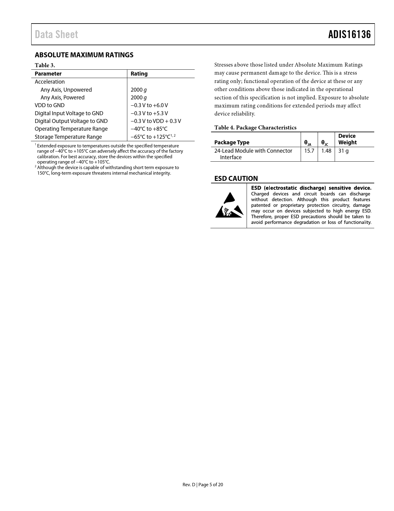 Data Sheet ADIS16136 ABSOLUTE MAXIMUM RATINGS Table 3 Parameter Rating Table 4 Package Characteristics Device Package Type