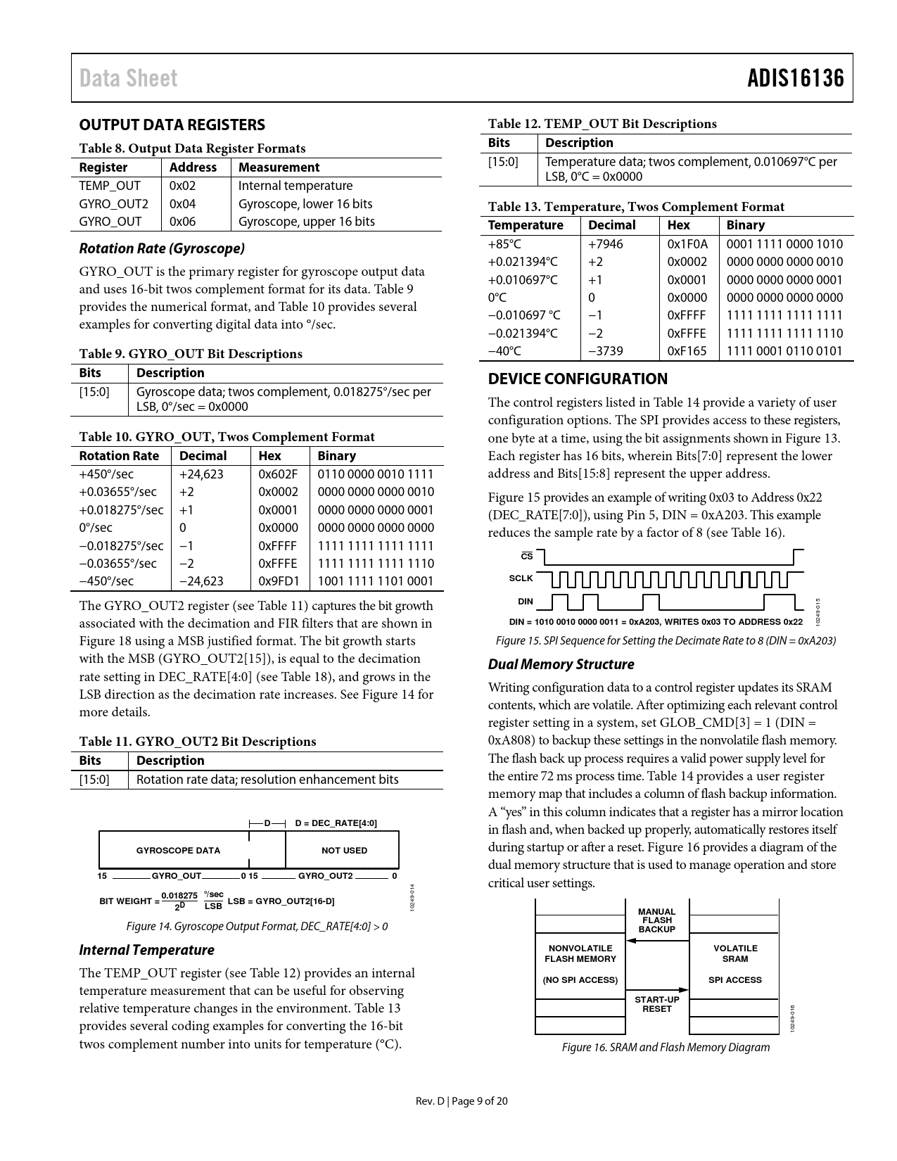 link to page 10 link to page 10 link to page 10 link to page 13 link to page 13 link to page 10 link to page 10 link to page 10 link to page 11 link to page 9 link to page 10 link to page 12 link to page 11 link to page 10 Data SheetADIS16136OUTPUT DATA REGISTERSTable 12. TEMP_OUT Bit DescriptionsTable 8. Output Data Register FormatsBitsDescriptionRegisterAddressMeasurement [15:0] Temperature data; twos complement, 0.010697°C per LSB, 0°C = 0x0000 TEMP_OUT 0x02 Internal temperature GYRO_OUT2 0x04 Gyroscope, lower 16 bits Table 13. Temperature, Twos Complement Format GYRO_OUT 0x06 Gyroscope, upper 16 bits TemperatureDecimalHexBinaryRotation Rate (Gyroscope) +85°C +7946 0x1F0A 0001 1111 0000 1010 +0.021394°C +2 0x0002 0000 0000 0000 0010 GYRO_OUT is the primary register for gyroscope output data +0.010697°C +1 0x0001 0000 0000 0000 0001 and uses 16-bit twos complement format for its data. Table 9 0°C 0 0x0000 0000 0000 0000 0000 provides the numerical format, and Table 10 provides several −0.010697 °C −1 0xFFFF 1111 1111 1111 1111 examples for converting digital data into °/sec. −0.021394°C −2 0xFFFE 1111 1111 1111 1110 Table 9. GYRO_OUT Bit Descriptions −40°C −3739 0xF165 1111 0001 0110 0101 BitsDescriptionDEVICE CONFIGURATION [15:0] Gyroscope data; twos complement, 0.018275°/sec per LSB, 0°/sec = 0x0000 The control registers listed in Table 14 provide a variety of user configuration options. The SPI provides access to these registers, Table 10. GYRO_OUT, Twos Complement Format one byte at a time, using the bit assignments shown in Figure 13. Rotation RateDecimalHexBinary Each register has 16 bits, wherein Bits[7:0] represent the lower +450°/sec +24,623 0x602F 0110 0000 0010 1111 address and Bits[15:8] represent the upper address. +0.03655°/sec +2 0x0002 0000 0000 0000 0010 Figure 15 provides an example of writing 0x03 to Address 0x22 +0.018275°/sec +1 0x0001 0000 0000 0000 0001 (DEC_RATE[7:0]), using Pin 5, DIN = 0xA203. This example 0°/sec 0 0x0000 0000 0000 0000 0000 reduces the sample rate by a factor of 8 (see Table 16). −0.018275°/sec −1 0xFFFF 1111 1111 1111 1111 −0.03655°/sec −2 0xFFFE 1111 1111 1111 1110 CS −450°/sec −24,623 0x9FD1 1001 1111 1101 0001 SCLK The GYRO_OUT2 register (see Table 11) captures the bit growth DIN 015 associated with the decimation and FIR filters that are shown in DIN = 1010 0010 0000 0011 = 0xA203, WRITES 0x03 TO ADDRESS 0x22 10249- Figure 18 using a MSB justified format. The bit growth starts Figure 15. SPI Sequence for Setting the Decimate Rate to 8 (DIN = 0xA203) with the MSB (GYRO_OUT2[15]), is equal to the decimation Dual Memory Structure rate setting in DEC_RATE[4:0] (see Table 18), and grows in the LSB direction as the decimation rate increases. See Figure 14 for Writing configuration data to a control register updates its SRAM more details. contents, which are volatile. After optimizing each relevant control register setting in a system, set GLOB_CMD[3] = 1 (DIN = Table 11. GYRO_OUT2 Bit Descriptions 0xA808) to backup these settings in the nonvolatile flash memory. BitsDescription The flash back up process requires a valid power supply level for [15:0] Rotation rate data; resolution enhancement bits the entire 72 ms process time. Table 14 provides a user register memory map that includes a column of flash backup information. A “yes” in this column indicates that a register has a mirror location DD = DEC_RATE[4:0] in flash and, when backed up properly, automatical y restores itself GYROSCOPE DATANOT USED during startup or after a reset. Figure 16 provides a diagram of the dual memory structure that is used to manage operation and store 15GYRO_OUT0 15GYRO_OUT20 critical user settings. 014 0.018275 °/secBIT WEIGHT =LSB = GYRO_OUT2[16-D]2DLSB 10249- MANUAL Figure 14. Gyroscope Output Format, DEC_RATE[4:0] > 0 FLASHBACKUPInternal TemperatureNONVOLATILEVOLATILEFLASH MEMORYSRAM The TEMP_OUT register (see Table 12) provides an internal (NO SPI ACCESS)SPI ACCESS temperature measurement that can be useful for observing relative temperature changes in the environment. Table 13 START-UPRESET 016 provides several coding examples for converting the 16-bit 10249- twos complement number into units for temperature (°C). Figure 16. SRAM and Flash Memory Diagram Rev. D | Page 9 of 20 Document Outline FEATURES APPLICATIONS GENERAL DESCRIPTION FUNCTIONAL BLOCK DIAGRAM TABLE OF CONTENTS REVISION HISTORY SPECIFICATIONS TIMING SPECIFICATIONS Timing Diagrams ABSOLUTE MAXIMUM RATINGS ESD CAUTION PIN CONFIGURATION AND FUNCTION DESCRIPTIONS TYPICAL PERFORMANCE CHARACTERISTICS THEORY OF OPERATION READING SENSOR DATA OUTPUT DATA REGISTERS Rotation Rate (Gyroscope) Internal Temperature DEVICE CONFIGURATION Dual Memory Structure USER REGISTERS DIGITAL PROCESSING CONFIGURATION INTERNAL SAMPLE RATE INPUT CLOCK CONFIGURATION DIGITAL FILTERING AVERAGING/DECIMATION FILTER CALIBRATION AUTOMATIC BIAS CORRECTION (AUTONULL) MANUAL BIAS CORRECTION Restoring Factory Calibration ALARMS STATIC ALARM USE DYNAMIC ALARM USE ALARM REPORTING Alarm Example SYSTEM CONTROLS GLOBAL COMMANDS Software Reset MEMORY MANAGEMENT Checksum Test GENERAL-PURPOSE INPUT/OUTPUT Data Ready Input/Output Indicator Example Input/Output Configuration AUTOMATIC SELF TEST POWER MANAGEMENT STATUS PRODUCT IDENTIFICATION APPLICATIONS INFORMATION POWER SUPPLY CONSIDERATIONS PROTOTYPE INTERFACE BOARD INSTALLATION TIPS PACKAGING AND ORDERING INFORMATION OUTLINE DIMENSIONS ORDERING GUIDE