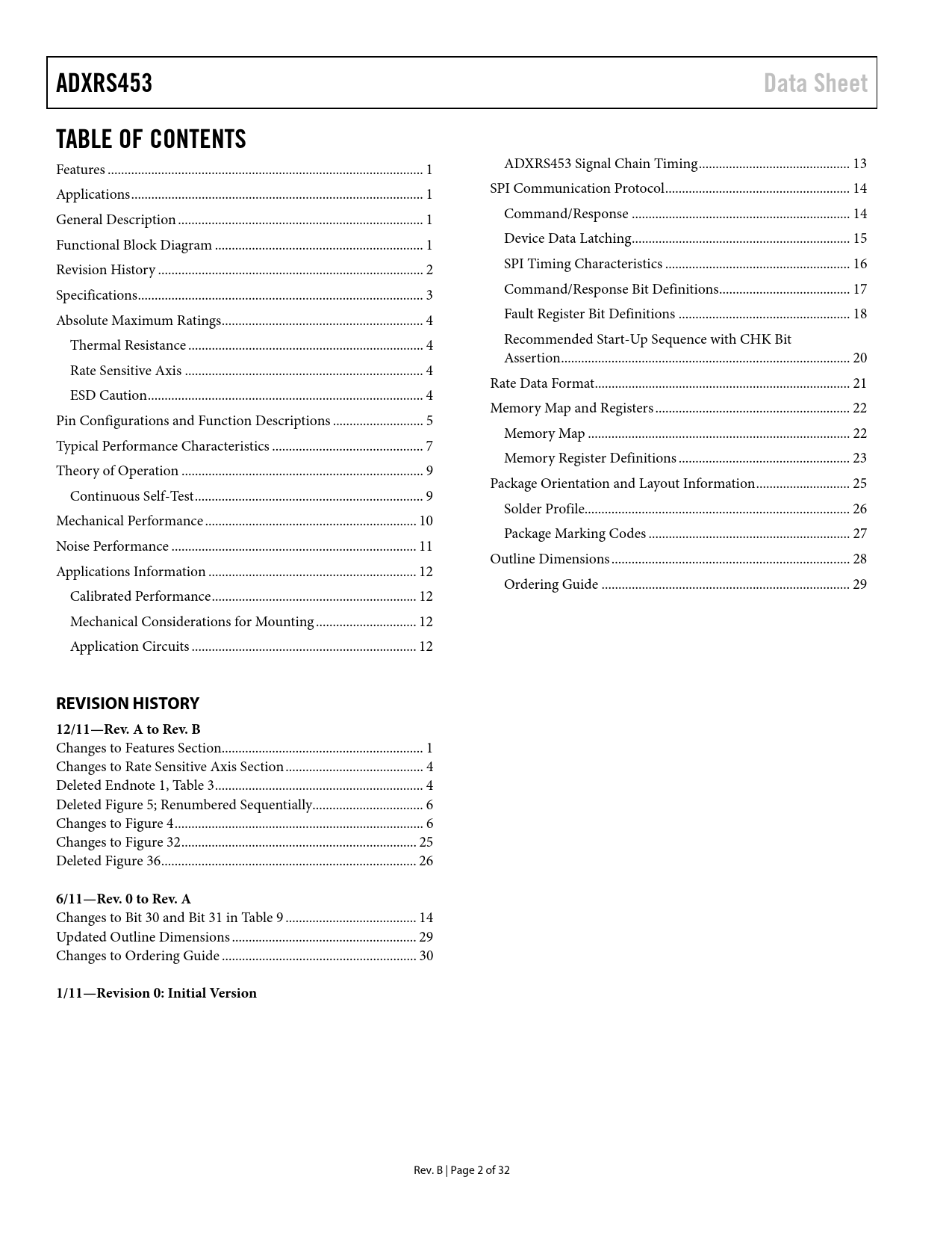 ADXRS453 Data Sheet TABLE OF CONTENTS REVISION HISTORY 12/11—Rev A to Rev B 6/11—Rev 0 to Rev A