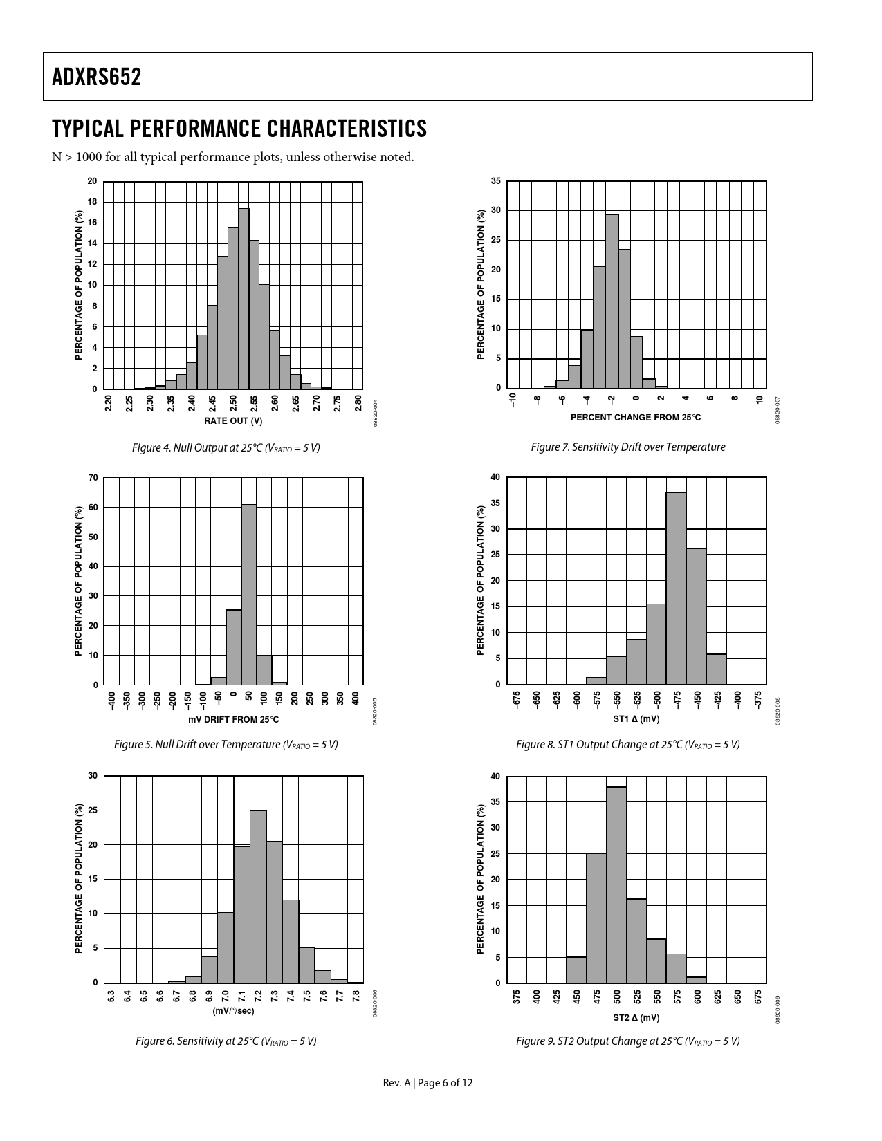 Modelllinie für dieses Datenblatt Textversion des Dokuments ADXRS652 TYPICAL PERFORMANCE CHARACTERISTICS N > 1000 for all typical performance plots, unless otherwise noted.20 35 18 ) ) 30 % (% 16 ( N N IO IO 14 25 T AT A L U 12 P PUL 20 O P 10 PO F F O O 15 E 8 E G AG A T NT 6 N 10 E C RCE 4 R E P PE 5 2 0 0 0 2 4 6 8 720 25 30 35 40 45 50 55 60 65 70 75 80 4–10 –8 –6 –4 –2 10 2. 2. 2. 2. 2. 2. 2. 2. 2. 2. 2. 2. 2. -00 -00 20RATE OUT (V) 820PERCENT CHANGE FROM 25°C 88 0 08 Figure 4. Null Output at 25°C (VRATIO = 5 V) Figure 7. Sensitivity Drift over Temperature70 40 ) 35 60 ) % % ( N ( N 30 IO 50 IO T A LAT U 25 P 40 PUL O P PO F 20 F O O 30 E E G 15 AG A T NT 20 N E CE 10 C R R E P 10 PE 5 0 0 0 0 0 0 0 0 0 0 50 –50 810 15 20 25 30 35 40 05675 650 625 600 575 550 525 500 475 450 425 400 –400 –350 –300 –250 –200 –150 –100 -0– – – – – – – – – – – – –375 -00 20 20mV DRIFT FROM 25°C 88ST1 Δ (mV) 88 0 0 Figure 5. Null Drift over Temperature (VRATIO = 5 V) Figure 8. ST1 Output Change at 25°C (VRATIO = 5 V)30 40 ) 35 ) 25 % (% ( N N 30 IO IO T T 20 25 PULA PULA PO 15 PO F 20 O OF E E G G A 15 A T 10 T EN EN C 10 C 5 ER PER P 5 0 0 3 4 5 6 7 8 9 0 1 2 3 4 5 6 7 8 060 5 0 5 6. 6. 6. 6. 6. 6. 6. 7. 7. 7. 7. 7. 7. 7. 7. 7. 0 9 0-375 400 425 450 475 500 525 550 575 60 62 65 67 -00(mV/°/sec) 82 20 08ST2 Δ (mV) 88 0 Figure 6. Sensitivity at 25°C (VRATIO = 5 V) Figure 9. ST2 Output Change at 25°C (VRATIO = 5 V) Rev. A | Page 6 of 12 Document Outline FEATURES APPLICATIONS GENERAL DESCRIPTION FUNCTIONAL BLOCK DIAGRAM TABLE OF CONTENTS REVISION HISTORY SPECIFICATIONS ABSOLUTE MAXIMUM RATINGS RATE SENSITIVE AXIS ESD CAUTION PIN CONFIGURATION AND FUNCTION DESCRIPTIONS TYPICAL PERFORMANCE CHARACTERISTICS THEORY OF OPERATION SETTING BANDWIDTH TEMPERATURE OUTPUT AND CALIBRATION MODIFYING THE ADXRS652 SCALE TO MATCH THE ADXRS620 CALIBRATED PERFORMANCE ADXRS652 AND SUPPLY RATIOMETRICITY NULL ADJUSTMENT SELF-TEST FUNCTION CONTINUOUS SELF-TEST OUTLINE DIMENSIONS ORDERING GUIDE