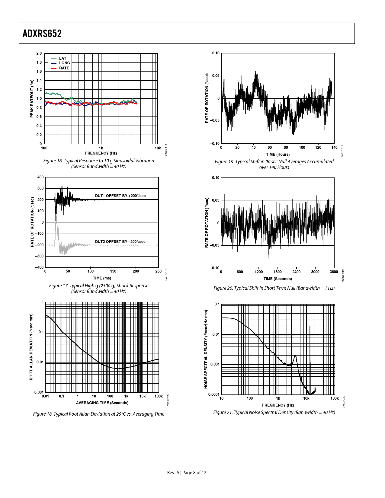 Modelllinie für dieses Datenblatt Textversion des Dokuments ADXRS6522.0 0.10 LAT 1.8 LONG RATE 1.6 ) c 0.05 e ) 1.4 s °/ °/s ( ( N T 1.2 U O O TI E 1.0 T TA 0 O R 0.8 AK RA OF E P 0.6 TE A –0.05 R 0.4 0.2 0 –0.10 16 8100 1k 10k 10 20 40 60 80 100 120 140 01 0- 0-FREQUENCY (Hz) 82 82 08TIME (Hours) 08 Figure 16. Typical Response to 10 g Sinusoidal Vibration Figure 19. Typical Shift in 90 sec Null Averages Accumulated (Sensor Bandwidth = 40 Hz) over 140 Hours400 0.10 300 ) DUT1 OFFSET BY +200°/sec 200 0.05 °/sec ( °/sec) ( N 100 N IO IO T T A T 0 A T 0 RO RO F –100 F O O E E DUT2 OFFSET BY –200°/sec –200 RAT –0.05 RAT –300 –400 –0.10 0 50 100 150 200 250 16 00 600 1200 1800 2400 3000 3600 19 0 0- 0-TIME (ms) 82 82 08TIME (Seconds) 08 Figure 17. Typical High g (2500 g) Shock Response Figure 20. Typical Shift in Short Term Null (Bandwidth = 1 Hz) (Sensor Bandwidth = 40 Hz)1 0.1 ) s s) m m r r Hz °/sec 0.1 N ( °/sec/ 0.01 ( IO Y IT IAT S V N DE L AN DE A L 0.01 R L T 0.001 A C T E O P S RO E IS NO 0.001 0.01 0.1 1 10 100 1k 10k 100k 170.0001 0 0 0-10 100 1k 10k 100k 02AVERAGING TIME (Seconds) 0- 882 0FREQUENCY (Hz) 82 08 Figure 18. Typical Root Allan Deviation at 25°C vs. Averaging Time Figure 21. Typical Noise Spectral Density (Bandwidth = 40 Hz) Rev. A | Page 8 of 12 Document Outline FEATURES APPLICATIONS GENERAL DESCRIPTION FUNCTIONAL BLOCK DIAGRAM TABLE OF CONTENTS REVISION HISTORY SPECIFICATIONS ABSOLUTE MAXIMUM RATINGS RATE SENSITIVE AXIS ESD CAUTION PIN CONFIGURATION AND FUNCTION DESCRIPTIONS TYPICAL PERFORMANCE CHARACTERISTICS THEORY OF OPERATION SETTING BANDWIDTH TEMPERATURE OUTPUT AND CALIBRATION MODIFYING THE ADXRS652 SCALE TO MATCH THE ADXRS620 CALIBRATED PERFORMANCE ADXRS652 AND SUPPLY RATIOMETRICITY NULL ADJUSTMENT SELF-TEST FUNCTION CONTINUOUS SELF-TEST OUTLINE DIMENSIONS ORDERING GUIDE