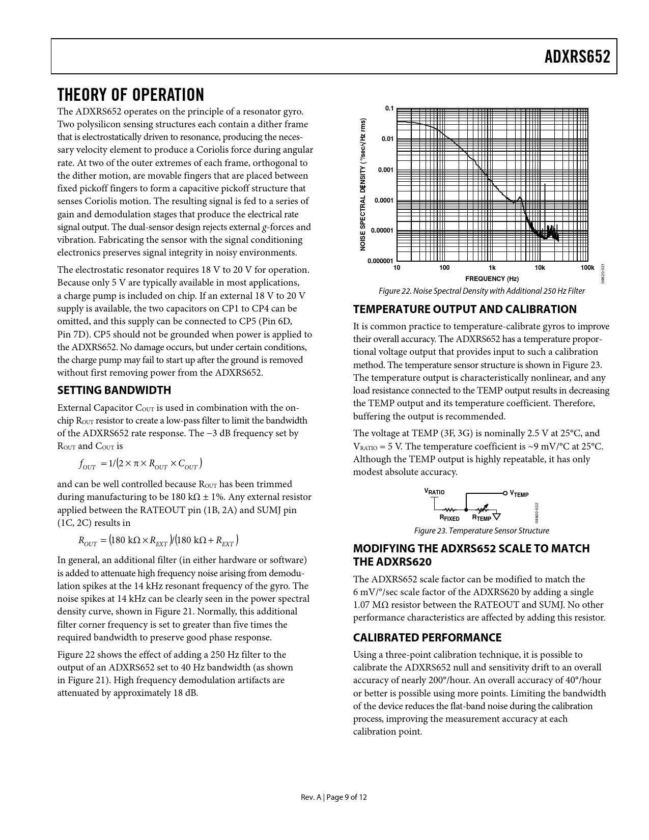 link to page 9 link to page 10 link to page 9 link to page 10 ADXRS652 THEORY OF OPERATION 0.1 The ADXRS652 operates on the principle of a resonator gyro. ) s Two polysilicon sensing structures each contain a dither frame m r that is electrostatically driven to resonance, producing the neces- 0.01Hz sary velocity element to produce a Coriolis force during angular °/sec/ rate. At two of the outer extremes of each frame, orthogonal to ( Y0.001IT the dither motion, are movable fingers that are placed between S N fixed pickoff fingers to form a capacitive pickoff structure that DE L A0.0001 senses Coriolis motion. The resulting signal is fed to a series of R T C gain and demodulation stages that produce the electrical rate E P signal output. The dual-sensor design rejects external g-forces and S0.00001E IS vibration. Fabricating the sensor with the signal conditioning NO electronics preserves signal integrity in noisy environments. 0.000001101001k10k100k 21 -0 The electrostatic resonator requires 18 V to 20 V for operation. 20 FREQUENCY (Hz) 88 0 Because only 5 V are typically available in most applications, a charge pump is included on chip. If an external 18 V to 20 V Figure 22. Noise Spectral Density with Additional 250 Hz Filter supply is available, the two capacitors on CP1 to CP4 can be TEMPERATURE OUTPUT AND CALIBRATION omitted, and this supply can be connected to CP5 (Pin 6D, It is common practice to temperature-calibrate gyros to improve Pin 7D). CP5 should not be grounded when power is applied to their overall accuracy. The ADXRS652 has a temperature propor- the ADXRS652. No damage occurs, but under certain conditions, tional voltage output that provides input to such a calibration the charge pump may fail to start up after the ground is removed method. The temperature sensor structure is shown in Figure 23. without first removing power from the ADXRS652. The temperature output is characteristically nonlinear, and any SETTING BANDWIDTH load resistance connected to the TEMP output results in decreasing the TEMP output and its temperature coefficient. Therefore, External Capacitor COUT is used in combination with the on- buffering the output is recommended. chip ROUT resistor to create a low-pass filter to limit the bandwidth of the ADXRS652 rate response. The −3 dB frequency set by The voltage at TEMP (3F, 3G) is nominally 2.5 V at 25°C, and ROUT and COUT is VRATIO = 5 V. The temperature coefficient is ~9 mV/°C at 25°C. Although the TEMP output is highly repeatable, it has only f = / 1 2 × π × R × C OUT ( OUT OUT ) modest absolute accuracy. and can be well controlled because ROUT has been trimmed V during manufacturing to be 180 kΩ ± 1%. Any external resistor RATIOVTEMP applied between the RATEOUT pin (1B, 2A) and SUMJ pin 22 -0 R 20 (1C, 2C) results in FIXEDRTEMP 88 0 Figure 23. Temperature Sensor Structure R = 180 kΩ × R / 180 kΩ + R OUT ( EXT ) ( EXT ) MODIFYING THE ADXRS652 SCALE TO MATCH In general, an additional filter (in either hardware or software) THE ADXRS620 is added to attenuate high frequency noise arising from demodu- The ADXRS652 scale factor can be modified to match the lation spikes at the 14 kHz resonant frequency of the gyro. The 6 mV/°/sec scale factor of the ADXRS620 by adding a single noise spikes at 14 kHz can be clearly seen in the power spectral 1.07 MΩ resistor between the RATEOUT and SUMJ. No other density curve, shown in Figure 21. Normally, this additional performance characteristics are affected by adding this resistor. filter corner frequency is set to greater than five times the required bandwidth to preserve good phase response. CALIBRATED PERFORMANCE Figure 22 shows the effect of adding a 250 Hz filter to the Using a three-point calibration technique, it is possible to output of an ADXRS652 set to 40 Hz bandwidth (as shown calibrate the ADXRS652 null and sensitivity drift to an overall in Figure 21). High frequency demodulation artifacts are accuracy of nearly 200°/hour. An overall accuracy of 40°/hour attenuated by approximately 18 dB. or better is possible using more points. Limiting the bandwidth of the device reduces the flat-band noise during the calibration process, improving the measurement accuracy at each calibration point. Rev. A | Page 9 of 12 Document Outline FEATURES APPLICATIONS GENERAL DESCRIPTION FUNCTIONAL BLOCK DIAGRAM TABLE OF CONTENTS REVISION HISTORY SPECIFICATIONS ABSOLUTE MAXIMUM RATINGS RATE SENSITIVE AXIS ESD CAUTION PIN CONFIGURATION AND FUNCTION DESCRIPTIONS TYPICAL PERFORMANCE CHARACTERISTICS THEORY OF OPERATION SETTING BANDWIDTH TEMPERATURE OUTPUT AND CALIBRATION MODIFYING THE ADXRS652 SCALE TO MATCH THE ADXRS620 CALIBRATED PERFORMANCE ADXRS652 AND SUPPLY RATIOMETRICITY NULL ADJUSTMENT SELF-TEST FUNCTION CONTINUOUS SELF-TEST OUTLINE DIMENSIONS ORDERING GUIDE
