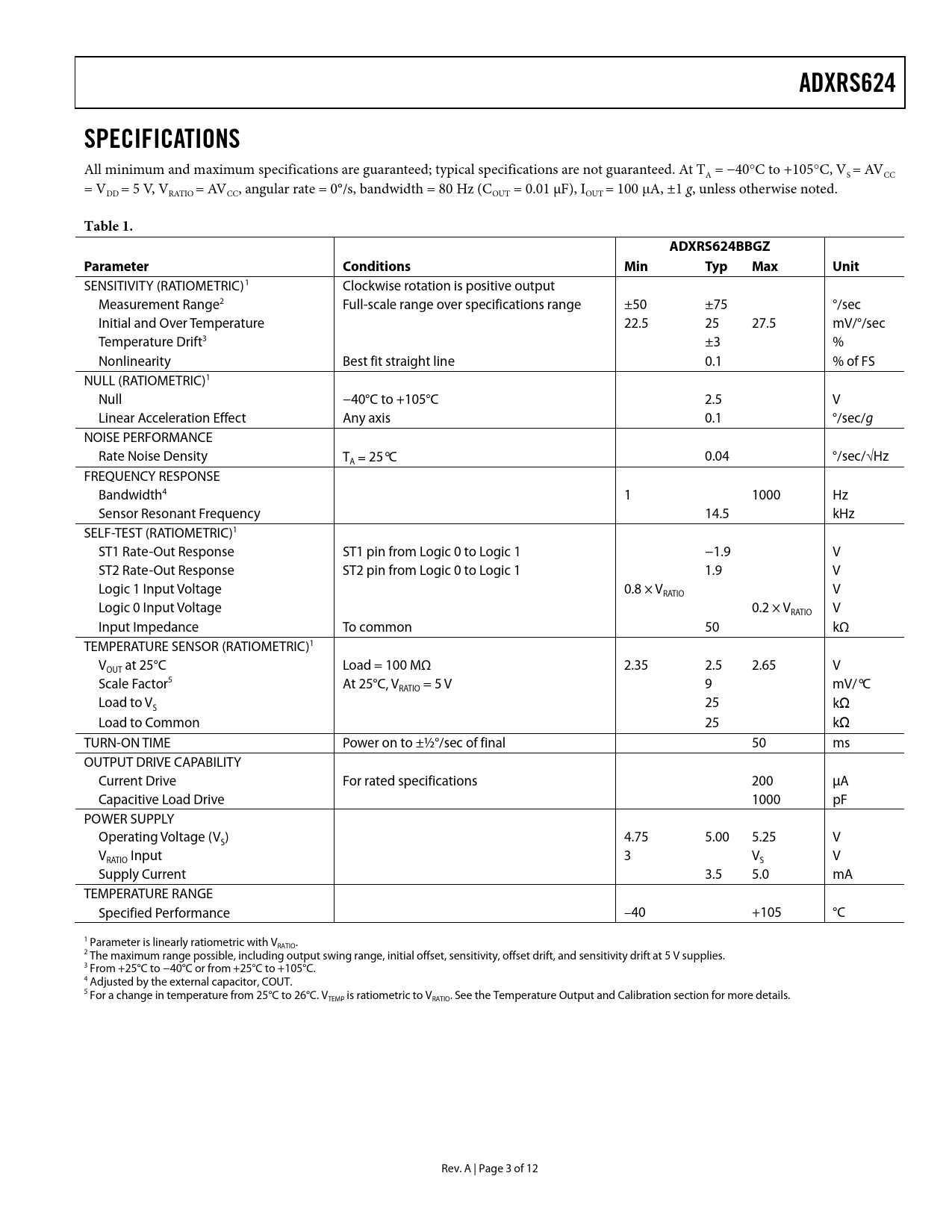 Seiten / Seite13 / 4 — ADXRS624. SPECIFICATIONS. Table 1. ADXRS624BBGZ. Parameter. Conditions. …