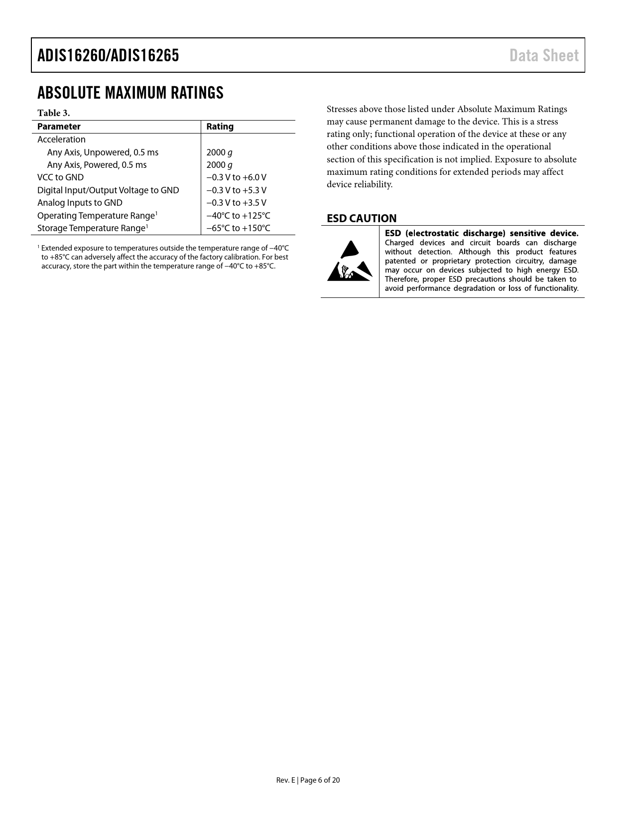 link to page 6 link to page 6 ADIS16260/ADIS16265Data SheetABSOLUTE MAXIMUM RATINGS Table 3. Stresses above those listed under Absolute Maximum Ratings ParameterRating may cause permanent damage to the device. This is a stress rating only; functional operation of the device at these or any Acceleration other conditions above those indicated in the operational Any Axis, Unpowered, 0.5 ms 2000 g section of this specification is not implied. Exposure to absolute Any Axis, Powered, 0.5 ms 2000 g maximum rating conditions for extended periods may affect VCC to GND −0.3 V to +6.0 V device reliability. Digital Input/Output Voltage to GND −0.3 V to +5.3 V Analog Inputs to GND −0.3 V to +3.5 V Operating Temperature Range1 −40°C to +125°C ESD CAUTION Storage Temperature Range1 −65°C to +150°C 1 Extended exposure to temperatures outside the temperature range of −40°C to +85°C can adversely affect the accuracy of the factory calibration. For best accuracy, store the part within the temperature range of −40°C to +85°C. Rev. E | Page 6 of 20 Document Outline Features Applications General Description Functional Block Diagram Table of Contents Revision History Specifications Timing Specifications Timing Diagrams Absolute Maximum Ratings ESD Caution Pin Configuration and Function Descriptions Typical Performance Characteristics Theory of Operation Sensing Element Data Sampling and Processing User Interface SPI Interface User Registers Basic Operation SPI Write Commands SPI Read Commands Memory Map Processing Sensor Data Operational Controls Internal Sample Rate Sensor Bandwidth Digital Filtering Dynamic Range Calibration Global Commands Power Management Input/Output Functions General-Purpose I/O Data Ready I/O Indicator Auxiliary DAC Diagnostics Self-Test Memory Test Status Alarm Registers Product Identification Applications Information Assembly Bias Optimization Interface Printed Circuit Board (PCB) Outline Dimensions Ordering Guide