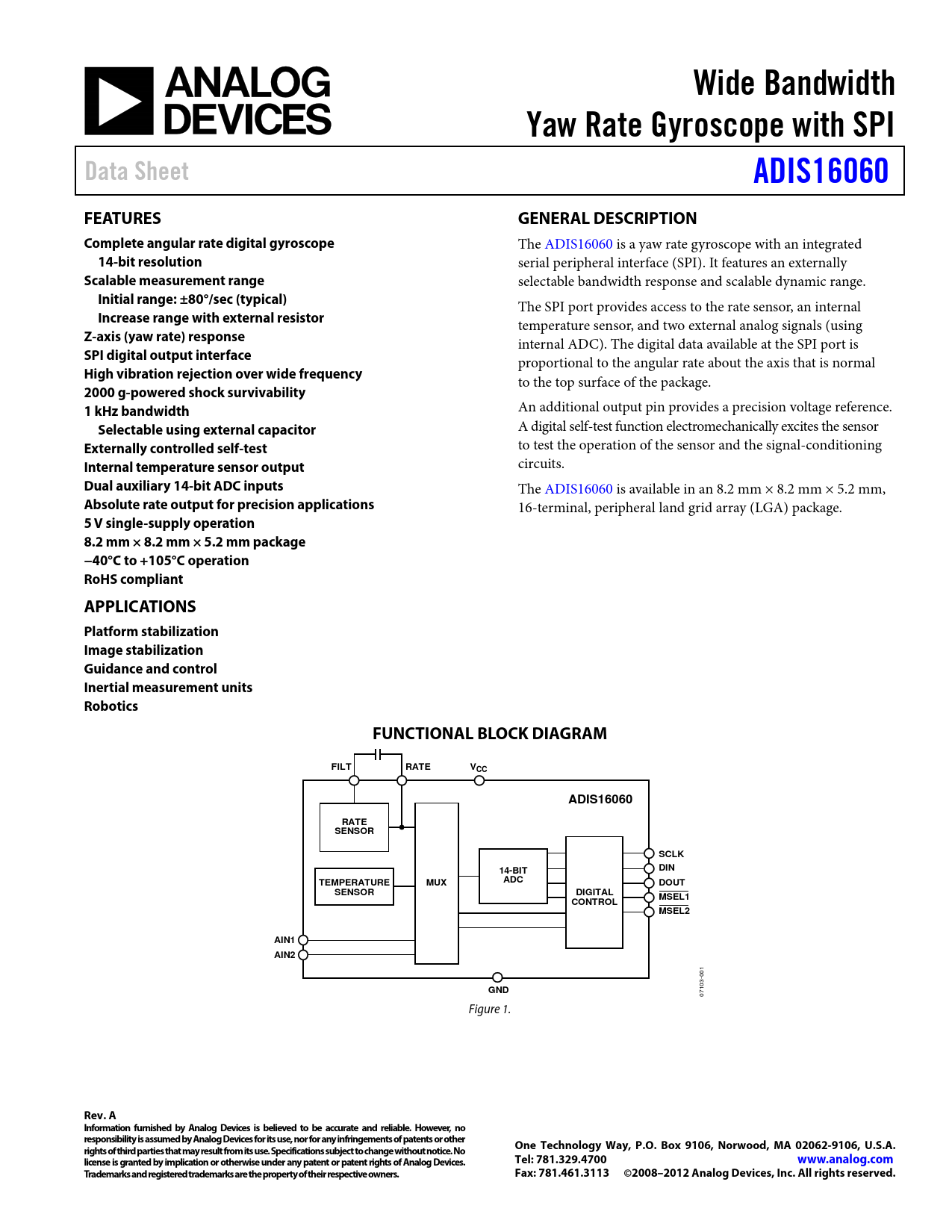 5 V single-supply operation 8.2 mm × 8.2 mm × 5.2 mm package −40°C to +105°C operation RoHS compliant APPLICATIONS Platform stabilization Image stabilization Guidance and control Inertial measurement units Robotics FUNCTIONAL BLOCK DIAGRAM FILT RATE VCC ADIS16060 RATE SENSOR SCLK DIN 14-BIT TEMPERATURE MUX ADC DOUT SENSOR DIGITAL MSEL1 CONTROL MSEL2 AIN1 AIN2