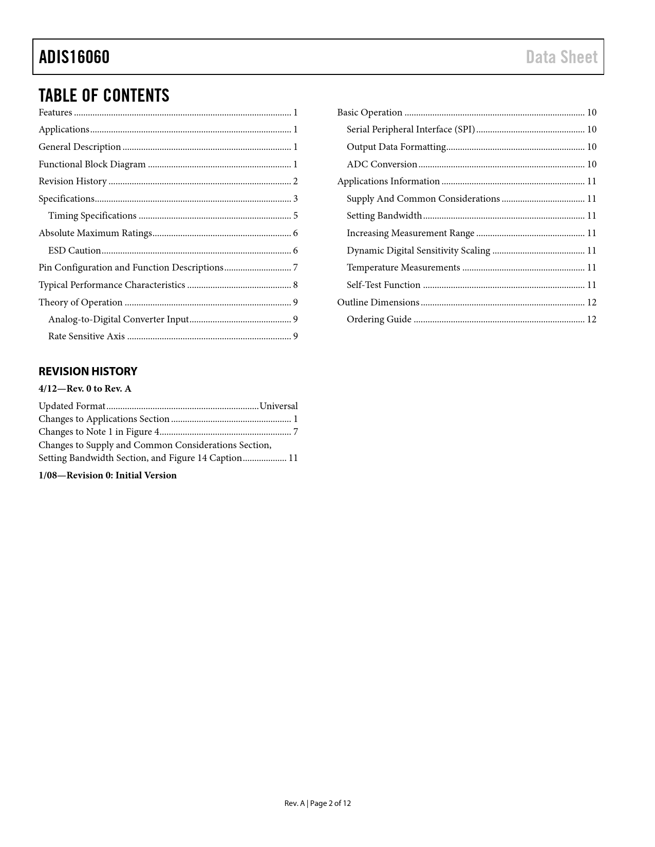 link to page 1 link to page 1 link to page 1 link to page 1 link to page 3 link to page 4 link to page 6 link to page 7 link to page 7 link to page 8 link to page 9 link to page 10 link to page 10 link to page 10 link to page 11 link to page 11 link to page 11 link to page 11 link to page 12 link to page 12 link to page 12 link to page 12 link to page 12 link to page 12 link to page 12 link to page 13 link to page 13 ADIS16060Data SheetTABLE OF CONTENTS Features .. 1 Basic Operation .. 10 Applications ... 1 Serial Peripheral Interface (SPI) ... 10 General Description ... 1 Output Data Formatting .. 10 Functional Block Diagram .. 1 ADC Conversion .. 10 Revision History ... 2 Applications Information .. 11 Specifications ... 3 Supply And Common Considerations .. 11 Timing Specifications .. 5 Setting Bandwidth .. 11 Absolute Maximum Ratings .. 6 Increasing Measurement Range ... 11 ESD Caution .. 6 Dynamic Digital Sensitivity Scaling .. 11 Pin Configuration and Function Descriptions ... 7 Temperature Measurements ... 11 Typical Performance Characteristics ... 8 Self-Test Function .. 11 Theory of Operation .. 9 Outline Dimensions ... 12 Analog-to-Digital Converter Input .. 9 Ordering Guide .. 12 Rate Sensitive Axis ... 9 REVISION HISTORY 4/12—Rev. 0 to Rev. A Updated Format .. Universal Changes to Applications Section .. 1 Changes to Note 1 in Figure 4 ... 7 Changes to Supply and Common Considerations Section, Setting Bandwidth Section, and Figure 14 Caption ... 11 1/08—Revision 0: Initial Version Rev. A | Page 2 of 12 Document Outline Features Applications General Description Functional Block Diagram Revision History Specifications Timing Specifications Timing Diagrams Absolute Maximum Ratings ESD Caution Pin Configuration and Function Descriptions Typical Performance Characteristics Theory of Operation Analog-to-Digital Converter Input Rate Sensitive Axis Basic Operation Serial Peripheral Interface (SPI) Selecting Output Data Output Data Access Output Data Formatting ADC Conversion Applications Information Supply And Common Considerations Setting Bandwidth Increasing Measurement Range Dynamic Digital Sensitivity Scaling Temperature Measurements Self-Test Function Outline Dimensions Ordering Guide