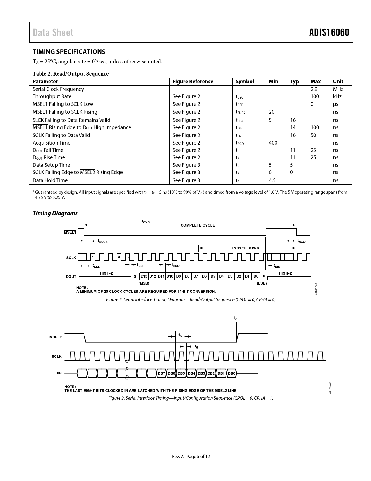 Data Sheet ADIS16060 TIMING SPECIFICATIONS Table 2 Read/Output Sequence Parameter Figure Reference Symbol Min Typ Max Unit