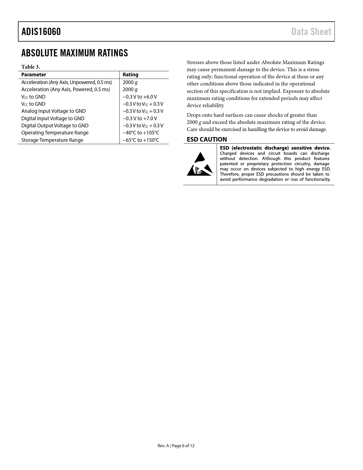 ADIS16060. Data Sheet. ABSOLUTE MAXIMUM RATINGS. Table 3. Parameter. Rating. ESD CAUTION