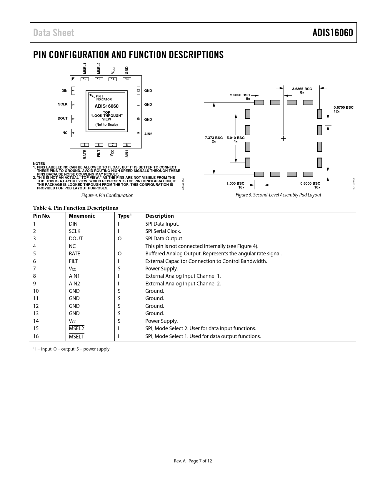 Data Sheet ADIS16060 PIN CONFIGURATION AND FUNCTION DESCRIPTIONS 1 2 CC ND MSEL MSEL V G 16 15 14 13 3.6865 BSC DIN 1 2 1 GND 2.5050 BSC PIN 1 INDICATOR SCLK 2 1 1 GND ADIS16060 0.6700 BSC TOP 12× “LOOK THROUGH” DOUT 3 VIEW 0 1 GND (Not to Scale) NC 4 9 AIN2 7.373 BSC 5.010 BSC 5 6 7 8 E CC N1 V FILT AI RAT NOTES 1. PINS LABELED NC CAN BE ALLOWED TO FLOAT, BUT IT IS BETTER TO CONNECT THESE PINS TO GROUND. AVOID ROUTING HIGH SPEED SIGNALS THROUGH THESE PINS BACAUSE NOISE COUPLING MAY RESULT. 2. THIS IS NOT AN ACTUAL “TOP VIEW,” AS THE PINS ARE NOT VISIBLE FROM THE