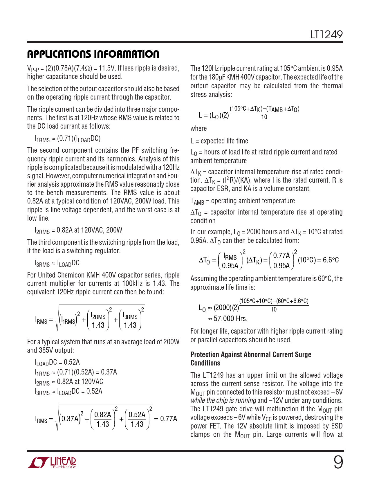 VP-P = (2)(0.78A)(7.4Ω) = 11.5V. If less ripple is desired, The 120Hz ripple current rating at 105°C ambient is 0.95A higher capacitance should be used. for the 180µF KMH 400V capacitor. The expected life of the The selection of the output capacitor should also be based output capacitor may be calculated from the thermal on the operating ripple current through the capacitor. stress analysis: The ripple current can be divided into three major compo- (105 C ° + T ∆ K)–(TAMB+ T ∆ O) nents. The first is at 120Hz whose RMS value is related to L = L ( O)( ) 2 10 the DC load current as follows: where I1RMS ≈ (0.71)(ILOADDC) L = expected life time The second component contains the PF switching fre- LO = hours of load life at rated ripple current and rated quency ripple current and its harmonics. Analysis of this ambient temperature ripple is complicated because it is modulated with a 120Hz ∆T signal. However, computer numerical integration and Fou- K = capacitor internal temperature rise at rated condi- tion. ∆T rier analysis approximate the RMS value reasonably close K = (I2R)/(KA), where I is the rated current, R is capacitor ESR, and KA is a volume constant. to the bench measurements. The RMS value is about 0.82A at a typical condition of 120VAC, 200W load. This TAMB = operating ambient temperature ripple is line voltage dependent, and the worst case is at ∆TO = capacitor internal temperature rise at operating low line. condition I2RMS = 0.82A at 120VAC, 200W In our example, LO = 2000 hours and ∆TK = 10°C at rated The third component is the switching ripple from the load, 0.95A. ∆TO can then be calculated from: if the load is a switching regulator. 2 2 I  0.7 A RMS 7  I ∆TO =  ∆ ( T ) 10 ( C) 6.6 C 3RMS ≈ ILOADDC  . A K  = 0.9 A 5  ° = ° 0 95 For United Chemicon KMH 400V capacitor series, ripple Assuming the operating ambient temperature is 60°C, the current multiplier for currents at 100kHz is 1.43. The approximate life time is: equivalent 120Hz ripple current can then be found: (105 C ° +10 C ° )–(60 C ° +6.6 C ° ) 2 2 LO ≈ ( ) 2000 ( ) 2 10 2 I  I  I I RMS 2 RMS = ( 3 ≈ 57,000 Hrs. 1 ) + RMS RMS  1 4 . 3  +  1 4 . 3  For longer life, capacitor with higher ripple current rating For a typical system that runs at an average load of 200W or parallel capacitors should be used. and 385V output: