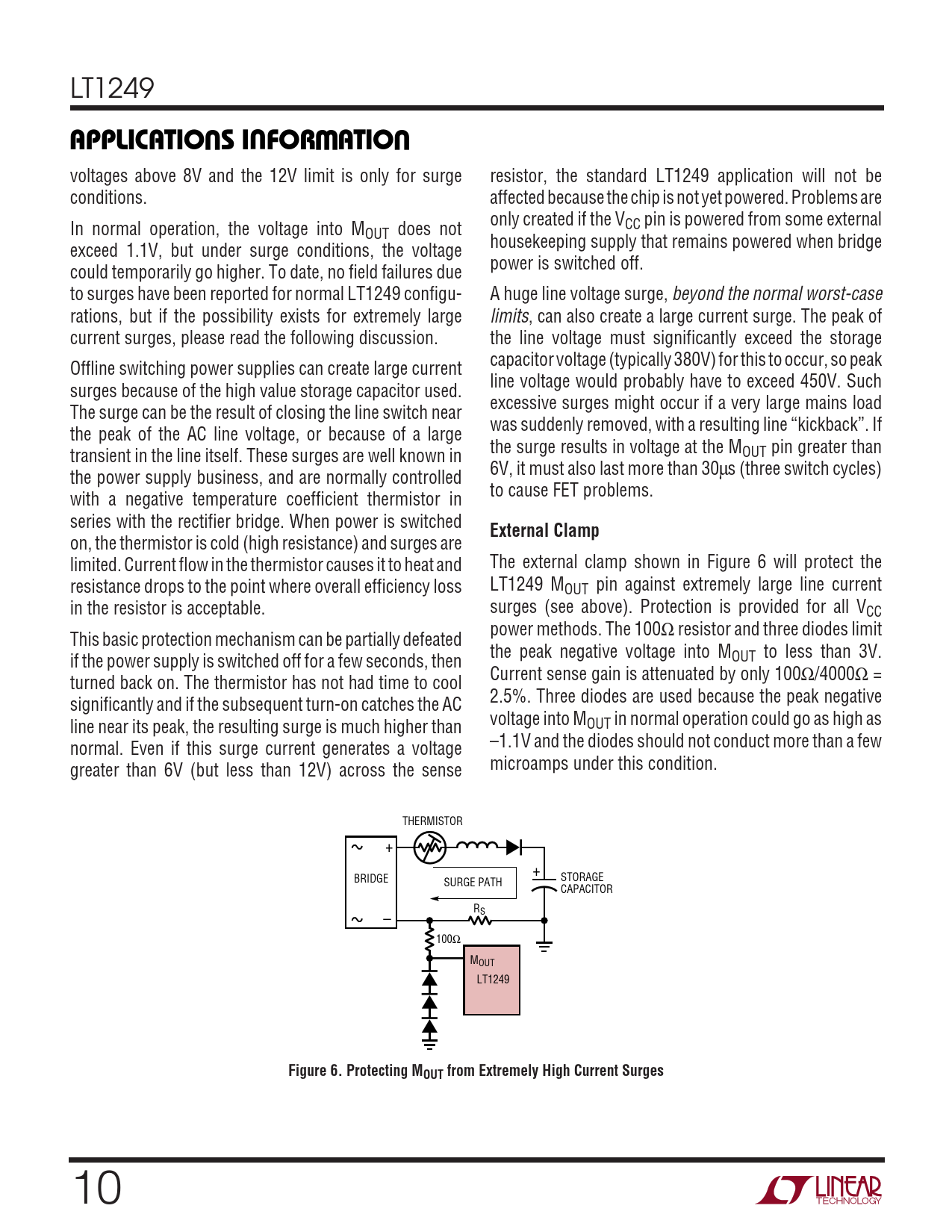 LT1249 UUWUAPPLICATIONS INFORMATION voltages above 8V and the 12V limit is only for surge resistor, the standard LT1249 application will not be conditions. affected because the chip is not yet powered. Problems are only created if the V In normal operation, the voltage into M CC pin is powered from some external OUT does not housekeeping supply that remains powered when bridge exceed 1.1V, but under surge conditions, the voltage power is switched off. could temporarily go higher. To date, no field failures due to surges have been reported for normal LT1249 configu- A huge line voltage surge, beyond the normal worst-case rations, but if the possibility exists for extremely large limits, can also create a large current surge. The peak of current surges, please read the following discussion. the line voltage must significantly exceed the storage capacitor voltage (typically 380V) for this to occur, so peak Offline switching power supplies can create large current line voltage would probably have to exceed 450V. Such surges because of the high value storage capacitor used. excessive surges might occur if a very large mains load The surge can be the result of closing the line switch near was suddenly removed, with a resulting line “kickback”. If the peak of the AC line voltage, or because of a large the surge results in voltage at the M transient in the line itself. These surges are well known in OUT pin greater than 6V, it must also last more than 30µs (three switch cycles) the power supply business, and are normally controlled to cause FET problems. with a negative temperature coefficient thermistor in series with the rectifier bridge. When power is switched External Clamp on, the thermistor is cold (high resistance) and surges are limited. Current flow in the thermistor causes it to heat and The external clamp shown in Figure 6 will protect the resistance drops to the point where overall efficiency loss LT1249 MOUT pin against extremely large line current in the resistor is acceptable. surges (see above). Protection is provided for all VCC power methods. The 100Ω resistor and three diodes limit This basic protection mechanism can be partially defeated the peak negative voltage into M if the power supply is switched off for a few seconds, then OUT to less than 3V. Current sense gain is attenuated by only 100Ω/4000Ω = turned back on. The thermistor has not had time to cool significantly and if the subsequent turn-on catches the AC 2.5%. Three diodes are used because the peak negative line near its peak, the resulting surge is much higher than voltage into MOUT in normal operation could go as high as normal. Even if this surge current generates a voltage –1.1V and the diodes should not conduct more than a few greater than 6V (but less than 12V) across the sense microamps under this condition. THERMISTOR + + BRIDGE STORAGE SURGE PATH CAPACITOR RS – 100Ω MOUT LT1249 Figure 6. Protecting MOUT from Extremely High Current Surges 10