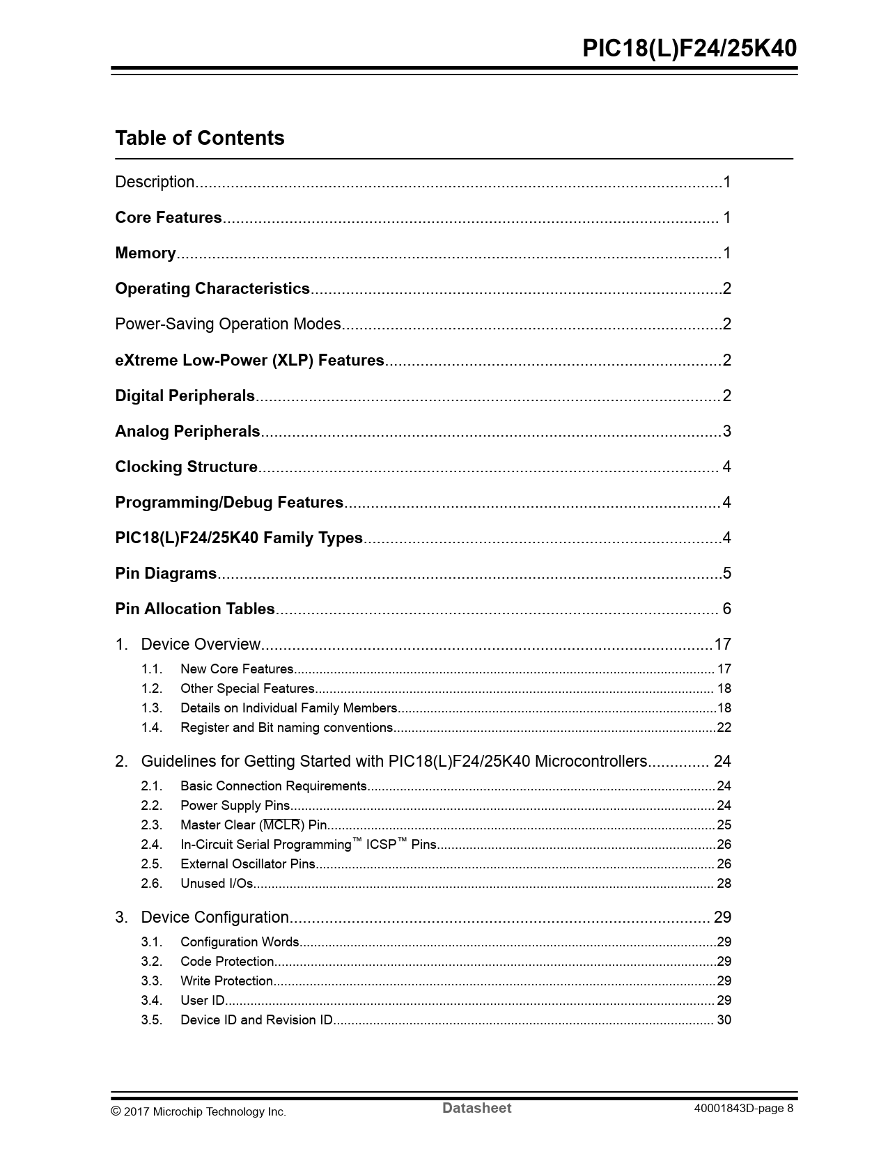.. 6 1. Device Overview..17 1.1. New Core Features.. 17 1.2. Other Special Features.. 18 1.3. Details on Individual Family Members..18 1.4. Register and Bit naming conventions...22 2. Guidelines for Getting Started with PIC18(L)F24/25K40 Microcontrollers.. 24 2.1. Basic Connection Requirements.. 24 2.2. Power Supply Pins... 24 2.3. Master Clear (MCLR) Pin... 25 2.4. In-Circuit Serial Programming™ ICSP™ Pins...26 2.5. External Oscillator Pins.. 26 2.6. Unused I/Os... 28 3. Device Configuration... 29 3.1. Configuration Words...29 3.2. Code Protection..29 3.3. Write Protection..29 3.4. User ID... 29 3.5. Device ID and Revision ID... 30 © 2017 Microchip Technology Inc.
