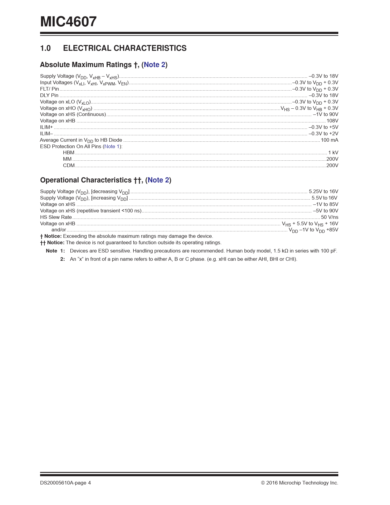 MIC4607 1.0 ELECTRICAL CHARACTERISTICS Absolute Maximum Ratings †, (Note 2) Supply Voltage (VDD, VxHB – VxHS). –0.3V to 18V Input Voltages (VxLI, VxHI, VxPWM, VEN). –0.3V to VDD + 0.3V FLT/ Pin. –0.3V to VDD + 0.3V DLY Pin . –0.3V to 18V Voltage on xLO (VxLO). –0.3V to VDD + 0.3V Voltage on xHO (VxHO) .VHS – 0.3V to VHB + 0.3V Voltage on xHS (Continuous). –1V to 90V Voltage on xHB . 108V ILIM+ . –0.3V to +5V ILIM– . –0.3V to +2V Average Current in VDD to HB Diode . 100 mA ESD Protection On All Pins (Note 1): HBM . 1 kV MM . 200V CDM. 200V Operational Characteristics ††, (Note 2) Supply Voltage (VDD), [decreasing VDD] . 5.25V to 16V Supply Voltage (VDD), [increasing VDD] . 5.5V to 16V Voltage on xHS . –1V to 85V Voltage on xHS (repetitive transient