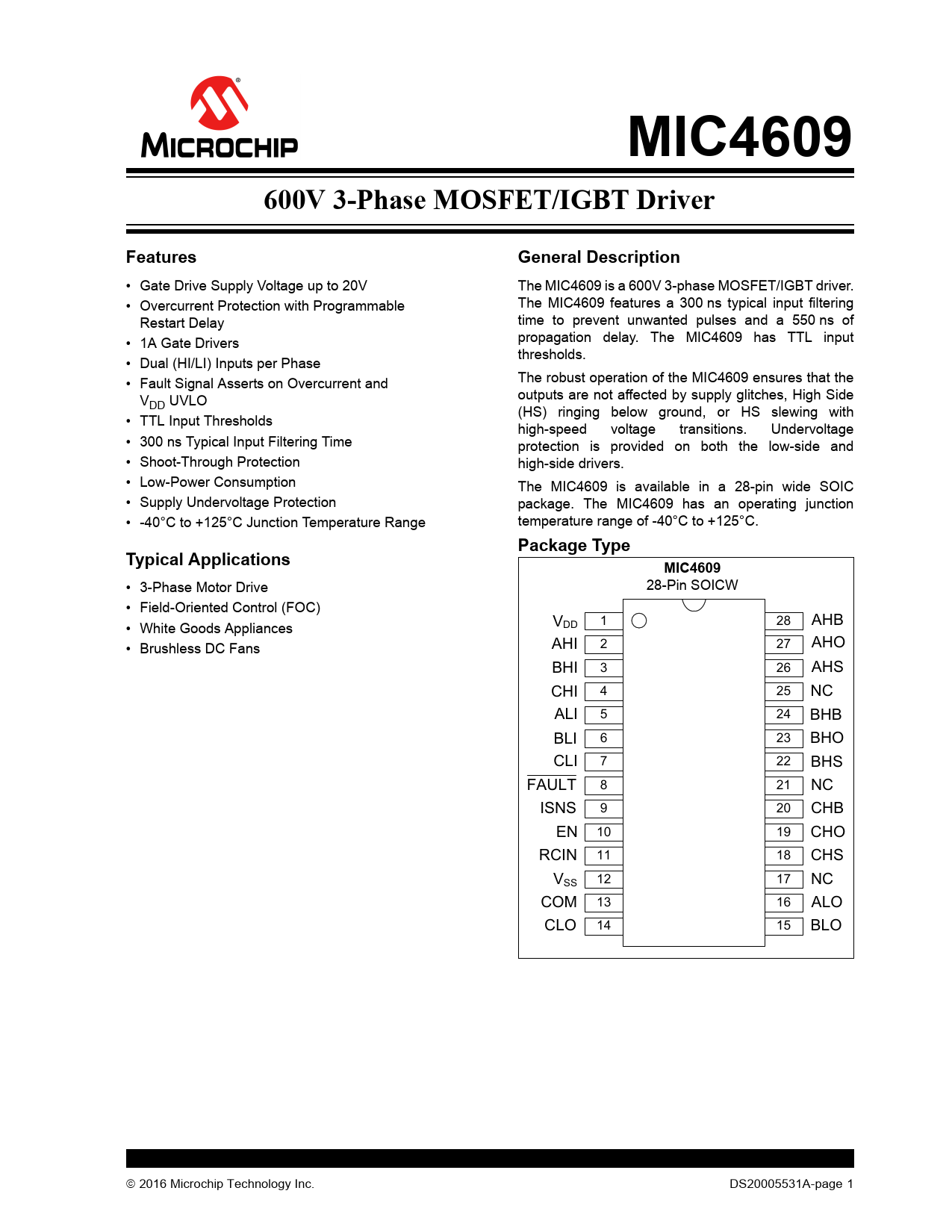 MIC4609600V 3-Phase MOSFET/IGBT DriverFeaturesGeneral Description • Gate Drive Supply Voltage up to 20V The MIC4609 is a 600V 3-phase MOSFET/IGBT driver. • Overcurrent Protection with Programmable The MIC4609 features a 300 ns typical input filtering Restart Delay time to prevent unwanted pulses and a 550 ns of • 1A Gate Drivers propagation delay. The MIC4609 has TTL input thresholds. • Dual (HI/LI) Inputs per Phase • Fault Signal Asserts on Overcurrent and The robust operation of the MIC4609 ensures that the V outputs are not affected by supply glitches, High Side DD UVLO (HS) ringing below ground, or HS slewing with • TTL Input Thresholds high-speed voltage transitions. Undervoltage • 300 ns Typical Input Filtering Time protection is provided on both the low-side and • Shoot-Through Protection high-side drivers. • Low-Power Consumption The MIC4609 is available in a 28-pin wide SOIC • Supply Undervoltage Protection package. The MIC4609 has an operating junction • -40°C to +125°C Junction Temperature Range temperature range of -40°C to +125°C. Package TypeTypical ApplicationsMIC4609 • 3-Phase Motor Drive 28-Pin SOICW • Field-Oriented Control (FOC) • White Goods Appliances V 1 28 AHB DD • Brushless DC Fans AHI 2 27 AHO BHI 3 26 AHS CHI 4 25 NC ALI 5 24 BHB BLI 6 23 BHO CLI 7 22 BHS FAULT 8 21 NC ISNS 9 20 CHB EN 10 19 CHO RCIN 11 18 CHS VSS 12 17 NC COM 13 16 ALO CLO 14 15 BLO 2016 Microchip Technology Inc. DS20005531A-page 1 Document Outline 600V 3-Phase MOSFET/IGBT Driver Features Typical Applications General Description Package Type Functional Block Diagram MIC4609 – Top Level Circuit Functional Block Diagram MIC4609 – Phase x Drive Circuit Typical Application Circuit MIC4609 – 300V, 3-Phase Motor Driver 1.0 Electrical Characteristics Absolute Maximum Ratings AC/DC Electrical Characteristics Temperature Characteristics 2.0 Typical Performance Curves FIGURE 2-1: VDD Quiescent Current vs. VDD Voltage. FIGURE 2-2: VDD Quiescent Current vs. Temperature. FIGURE 2-3: VHB Quiescent Current vs. VHB Voltage. FIGURE 2-4: VHB Quiescent Current vs. Temperature. FIGURE 2-5: VDD+HB Shutdown Current vs. Voltage. FIGURE 2-6: VDD+HB Shutdown Current vs. Temperature. FIGURE 2-7: VDD+HB Shutdown Current vs. Voltage. FIGURE 2-8: VDD+HB Shutdown Current vs. Temperature. FIGURE 2-9: VDD Operating Current vs. Frequency. FIGURE 2-10: VHB Operating Current vs. Frequency – One Phase. FIGURE 2-11: HO Output Sink ON-Resistance vs. VDD. FIGURE 2-12: HO Output Sink ON-Resistance vs. Temperature. FIGURE 2-13: LO Output Sink ON-Resistance vs. VDD. FIGURE 2-14: LO Output Sink ON-Resistance vs. Temperature. FIGURE 2-15: HO Output Source ON-Resistance vs. VDD. FIGURE 2-16: HO Output Source ON-Resistance vs. Temperature. FIGURE 2-17: LO Output Source ON-Resistance vs. VDD. FIGURE 2-18: LO Output Source ON-Resistance vs. Temperature. FIGURE 2-19: VDD/VHB ULVO vs. Temperature. FIGURE 2-20: Propagation Delay vs. VDD Voltage. FIGURE 2-21: Propagation Delay vs. Temperature. FIGURE 2-22: HO Rise Time vs. VDD Voltage. FIGURE 2-23: HO Fall Time vs. VDD Voltage. FIGURE 2-24: LO Rise Time vs. VDD Voltage. FIGURE 2-25: LO Fall Time vs. VDD Voltage. FIGURE 2-26: Rise/Fall Time vs. Temperature (VDD = 10V). FIGURE 2-27: Rise/Fall Time vs. Temperature (VDD = 20V). FIGURE 2-28: Dead Time vs. VDD Voltage. FIGURE 2-29: Dead Time vs. Temperature (VDD = 10V). FIGURE 2-30: Dead Time vs. Temperature (VDD = 20V). FIGURE 2-31: Overcurrent Threshold vs. VDD Voltage. FIGURE 2-32: Overcurrent Threshold vs. Temperature. FIGURE 2-33: Overcurrent Propagation Delay vs. VDD Voltage. FIGURE 2-34: Overcurrent Propagation Delay vs. Temperature. 3.0 Pin Descriptions TABLE 3-1: Pin Function Table 4.0 Functional Description 4.1 UVLO Protection 4.2 Startup and UVLO FIGURE 4-1: Startup and Fault Timing Diagram. TABLE 4-1: Operational Truth Table 4.3 Enable Inputs 4.4 Input Stage FIGURE 4-2: Input Stage Block Diagram. FIGURE 4-3: Minimum Pulse-Width Diagram. 4.5 Dead Time and Anti-Shoot-Through Protection FIGURE 4-4: Dead Time, Propagation Delay, and Rise/Fall-Time Diagram. 4.6 Low-Side Driver Output Stage FIGURE 4-5: Low-Side Driver Block Diagram. 4.7 High-Side Driver and Bootstrap Circuit FIGURE 4-6: High-Side Driver and Bootstrap Circuit Block Diagram. FIGURE 4-7: MIC4609 Motor Driver Typical Application – Phase A. 4.8 Overcurrent Protection Circuitry FIGURE 4-8: Overcurrent Fault Sequence. EQUATION 4-1: 5.0 Application Information 5.1 Bootstrap Circuit FIGURE 5-1: MIC4609 – Bootstrap Circuit. EQUATION 5-1: EQUATION 5-2: 5.2 HS Node Clamp FIGURE 5-2: Negative HS Pin Voltage. 5.3 Power Dissipation Considerations FIGURE 5-3: MIC4609 High-Side Driving an External IGBT. FIGURE 5-4: Typical Gate Charge vs. VGE. EQUATION 5-3: EQUATION 5-4: EQUATION 5-5: EQUATION 5-6: EQUATION 5-7: 5.4 Decoupling Capacitor Selection 5.5 Grounding, Component Placement and Circuit Layout FIGURE 5-5: Turn-On Current Paths. FIGURE 5-6: Turn-Off Current Paths. 6.0 Packaging Information Appendix A: Revision History Revision A (March 2016) Product Identification System Trademarks Worldwide Sales and Service