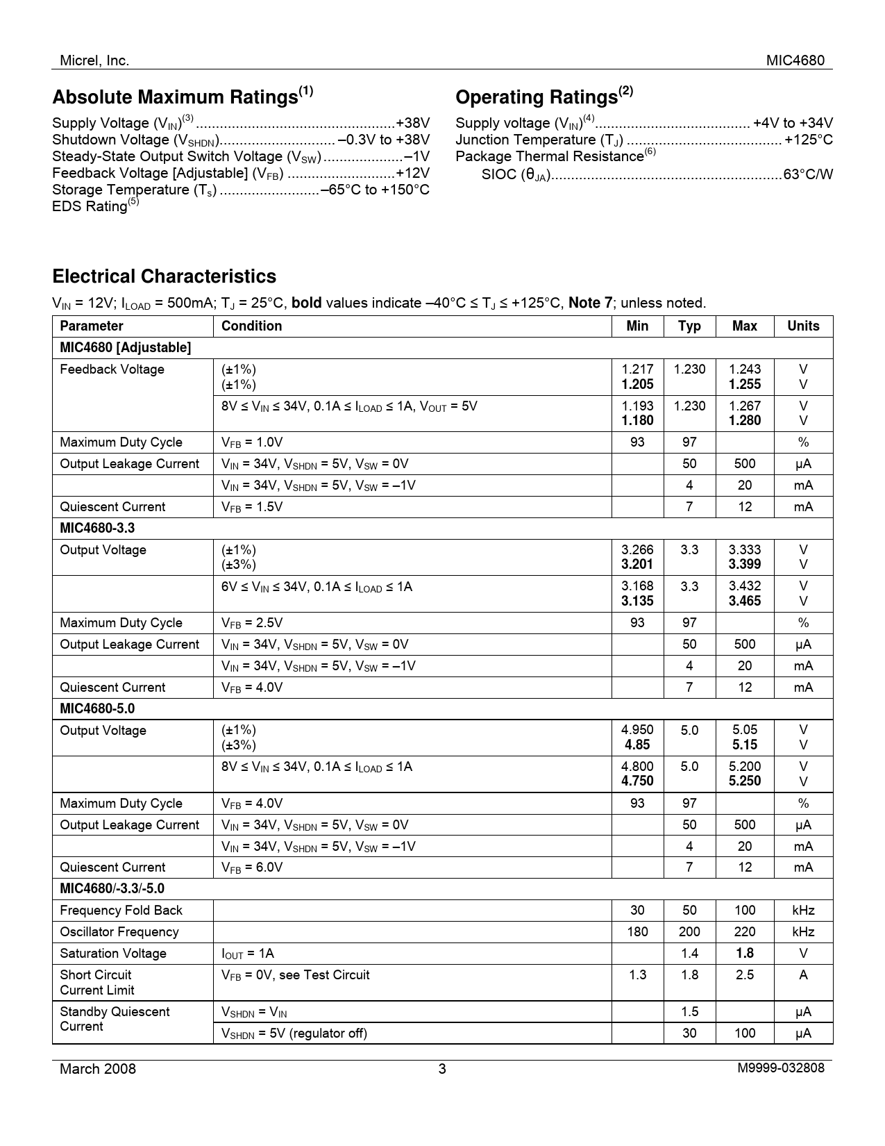 Micrel, Inc. MIC4680 Absolute Maximum Ratings(1) Operating Ratings(2) Supply Voltage (VIN)(3) .+38V