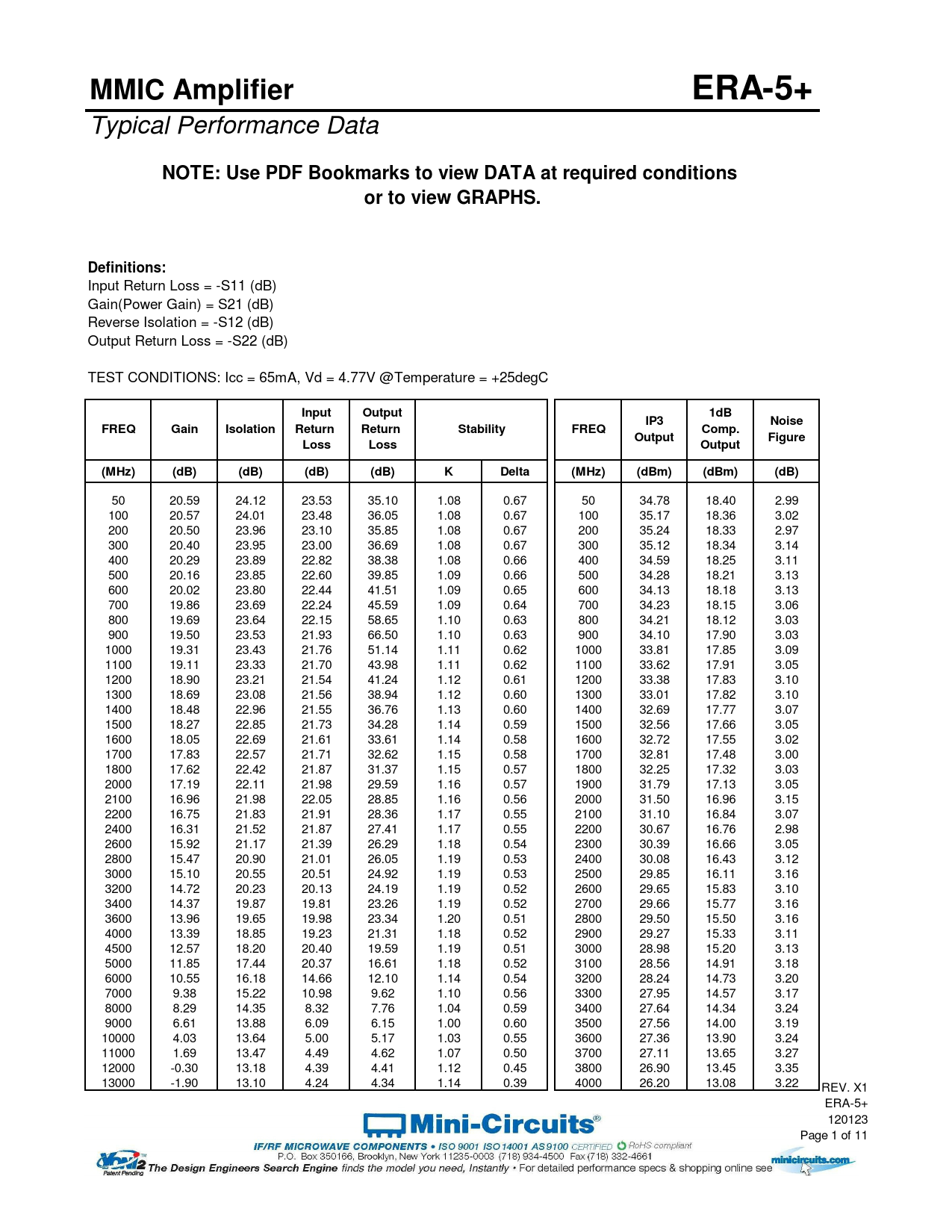 MMIC Amplifier. ERA-5+. NOTE: Use PDF Bookmarks to view DATA at required conditions. or to view GRAPHS. Definitions:. Input. Output