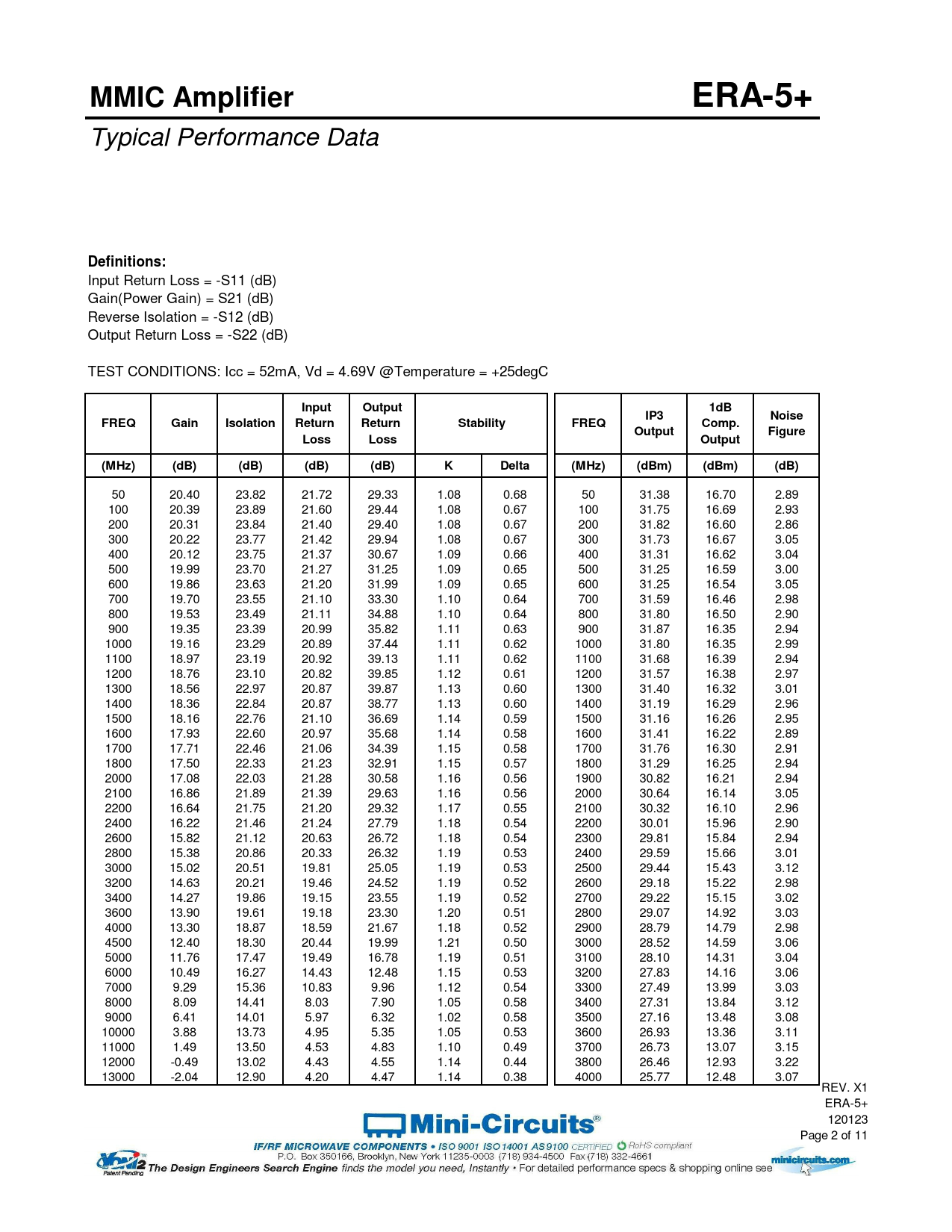 MMIC Amplifier. ERA-5+. Definitions:. Input. Output. 1dB. IP3. Noise. FREQ. Gain. Isolation. Return. Stability. Comp. Figure. Loss. (MHz). (dB). Delta. (dBm)