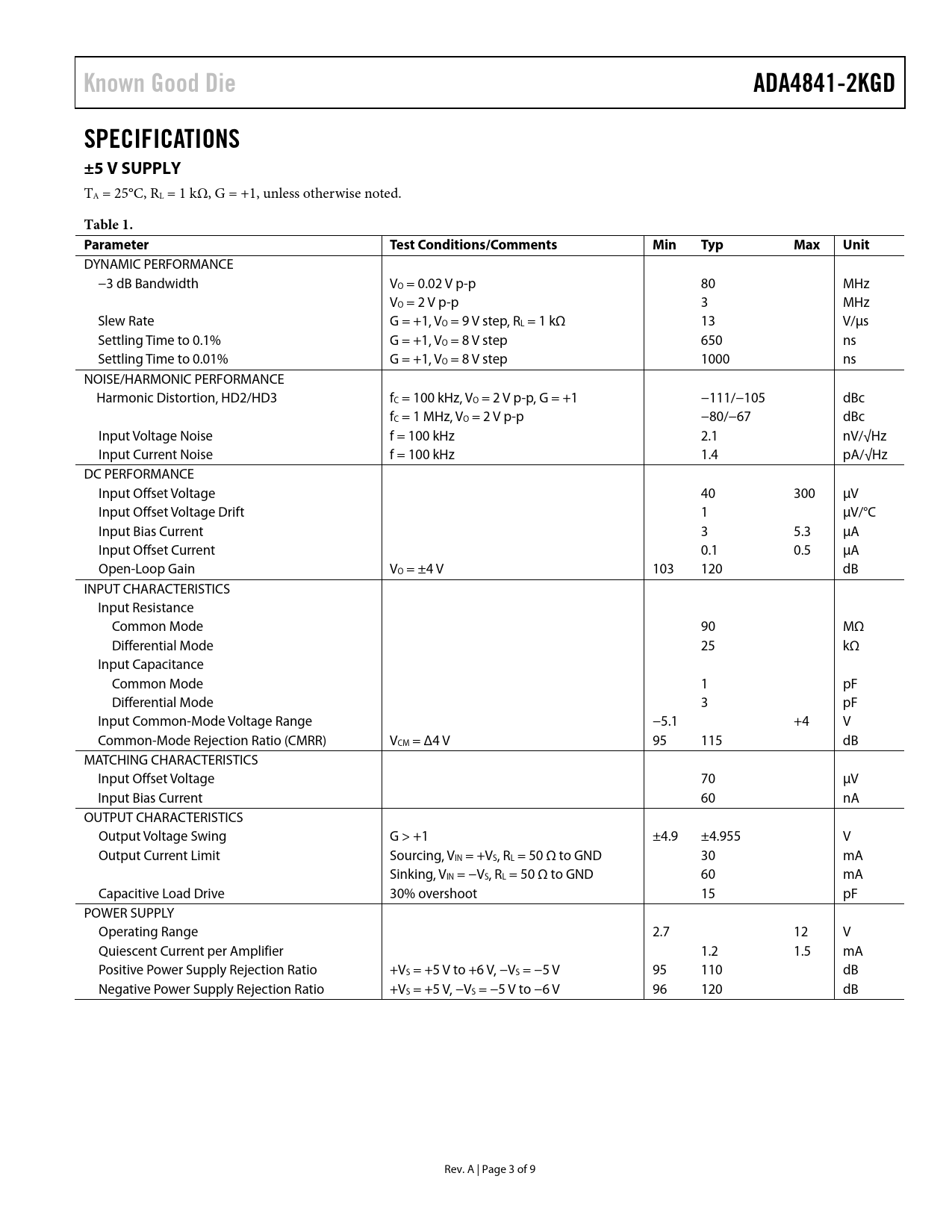 Known Good DieADA4841-2KGDSPECIFICATIONS ±5 V SUPPLY TA = 25°C, RL = 1 kΩ, G = +1, unless otherwise noted. Table 1. Parameter TestConditions/CommentsMinTypMaxUnit DYNAMIC PERFORMANCE −3 dB Bandwidth VO = 0.02 V p-p 80 MHz VO = 2 V p-p 3 MHz Slew Rate G = +1, VO = 9 V step, RL = 1 kΩ 13 V/μs Settling Time to 0.1% G = +1, VO = 8 V step 650 ns Settling Time to 0.01% G = +1, VO = 8 V step 1000 ns NOISE/HARMONIC PERFORMANCE Harmonic Distortion, HD2/HD3 fC = 100 kHz, VO = 2 V p-p, G = +1 −111/−105 dBc fC = 1 MHz, VO = 2 V p-p −80/−67 dBc Input Voltage Noise f = 100 kHz 2.1 nV/√Hz Input Current Noise f = 100 kHz 1.4 pA/√Hz DC PERFORMANCE Input Offset Voltage 40 300 μV Input Offset Voltage Drift 1 μV/°C Input Bias Current 3 5.3 μA Input Offset Current 0.1 0.5 μA Open-Loop Gain VO = ±4 V 103 120 dB INPUT CHARACTERISTICS Input Resistance Common Mode 90 MΩ Differential Mode 25 kΩ Input Capacitance Common Mode 1 pF Differential Mode 3 pF Input Common-Mode Voltage Range −5.1 +4 V Common-Mode Rejection Ratio (CMRR) VCM = Δ4 V 95 115 dB MATCHING CHARACTERISTICS Input Offset Voltage 70 μV Input Bias Current 60 nA OUTPUT CHARACTERISTICS Output Voltage Swing G > +1 ±4.9 ±4.955 V Output Current Limit Sourcing, VIN = +VS, RL = 50 Ω to GND 30 mA Sinking, VIN = −VS, RL = 50 Ω to GND 60 mA Capacitive Load Drive 30% overshoot 15 pF POWER SUPPLY Operating Range 2.7 12 V Quiescent Current per Amplifier 1.2 1.5 mA Positive Power Supply Rejection Ratio +VS = +5 V to +6 V, −VS = −5 V 95 110 dB Negative Power Supply Rejection Ratio +VS = +5 V, −VS = −5 V to −6 V 96 120 dB Rev. A | Page 3 of 9 Document Outline FEATURES APPLICATIONS FUNCTIONAL BLOCK DIAGRAM GENERAL DESCRIPTION TABLE OF CONTENTS REVISION HISTORY SPECIFICATIONS ±5 V SUPPLY 5 V SUPPLY 3 V SUPPLY ABSOLUTE MAXIMUM RATINGS ESD CAUTION PIN CONFIGURATION AND FUNCTION DESCRIPTIONS OUTLINE DIMENSIONS DIE SPECIFICATIONS AND ASSEMBLY RECOMMENDATIONS ORDERING GUIDE