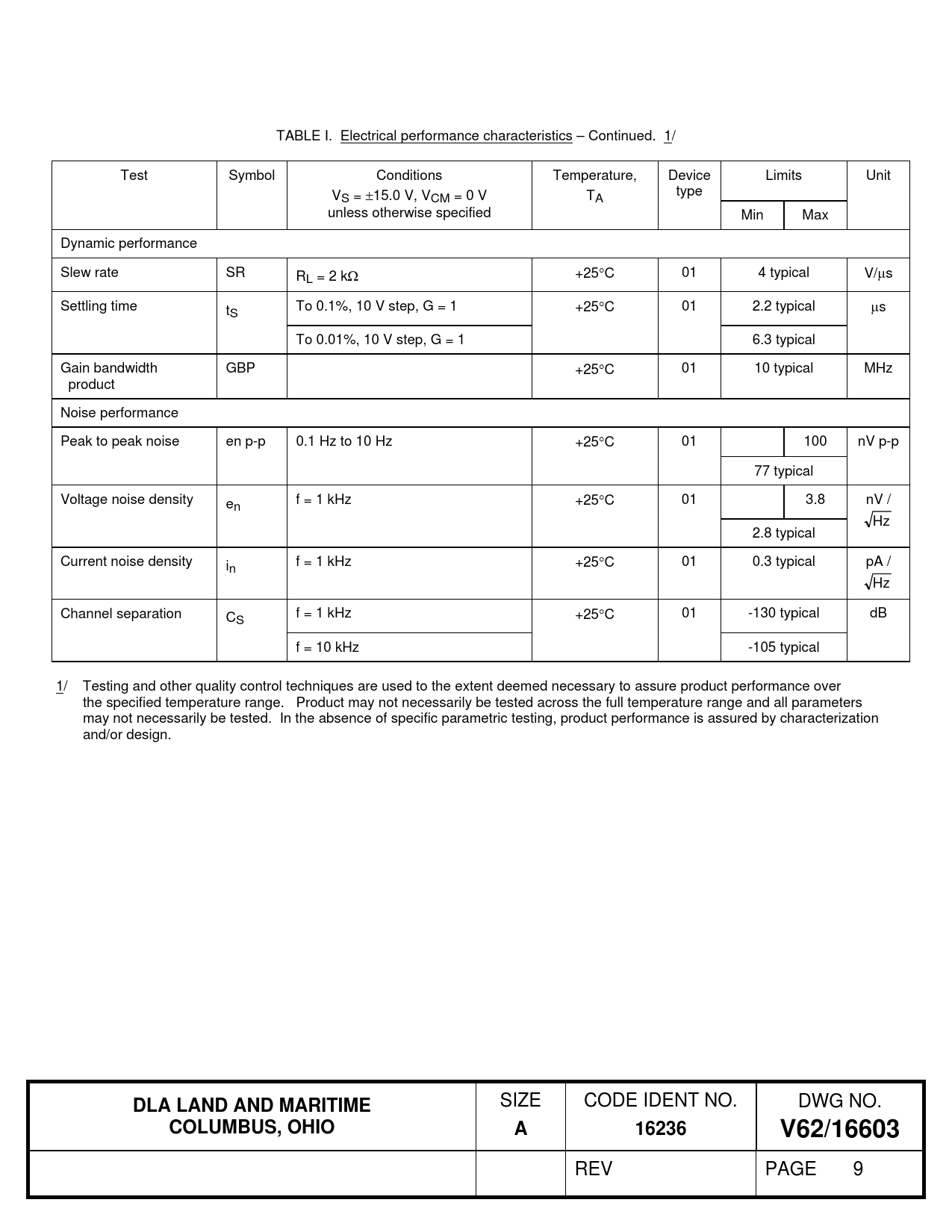 TABLE I. Electrical performance characteristics – Continued. 1/ Test Symbol Conditions Temperature, Device Limits Unit V type S = 15.0 V, VCM = 0 V TA unless otherwise specified Min Max Dynamic performance Slew rate SR RL = 2 k +25C 01 4 typical V/s Settling time tS To 0.1%, 10 V step, G = 1 +25C 01 2.2 typical s To 0.01%, 10 V step, G = 1 6.3 typical Gain bandwidth GBP +25C 01 10 typical MHz product Noise performance Peak to peak noise en p-p 0.1 Hz to 10 Hz +25C 01 100 nV p-p 77 typical Voltage noise density en f = 1 kHz +25C 01 3.8 nV / Hz 2.8 typical Current noise density in f = 1 kHz +25C 01 0.3 typical pA / Hz Channel separation CS f = 1 kHz +25C 01 -130 typical dB f = 10 kHz -105 typical 1/ Testing and other quality control techniques are used to the extent deemed necessary to assure product performance over the specified temperature range. Product may not necessarily be tested across the full temperature range and all parameters may not necessarily be tested. In the absence of specific parametric testing, product performance is assured by characterization and/or design. DLA LAND AND MARITIME SIZE CODE IDENT NO. DWG NO. COLUMBUS, OHIOA16236V62/16603 REV PAGE 9