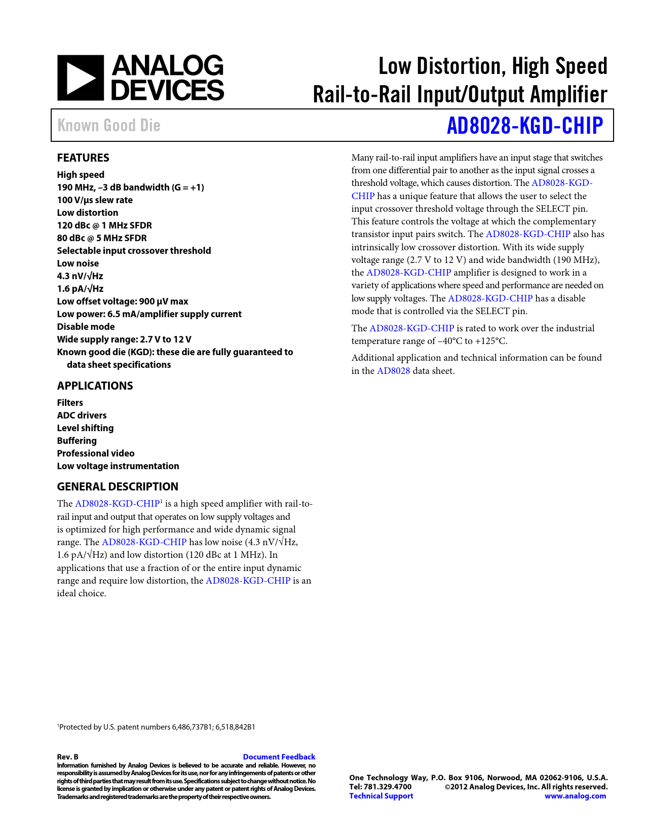 The AD8028-KGD-CHIP1 is a high speed amplifier with rail-to- rail input and output that operates on low supply voltages and is optimized for high performance and wide dynamic signal range. The AD8028-KGD-CHIP has low noise (4.3 nV/√Hz, 1.6 pA/√Hz) and low distortion (120 dBc at 1 MHz). In applications that use a fraction of or the entire input dynamic range and require low distortion, the AD8028-KGD-CHIP is an ideal choice. 1Protected by U.S. patent numbers 6,486,737B1; 6,518,842B1