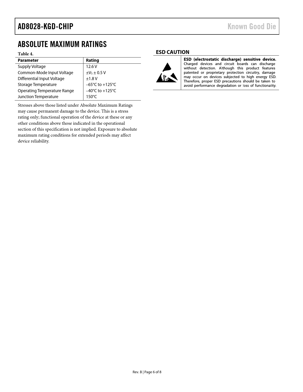 AD8028-KGD-CHIPKnown Good DieABSOLUTE MAXIMUM RATINGS Table 4.ESD CAUTIONParameterRating Supply Voltage 12.6 V Common-Mode Input Voltage ±VS ± 0.5 V Differential Input Voltage ±1.8 V Storage Temperature –65°C to +125°C Operating Temperature Range –40°C to +125°C Junction Temperature 150°C Stresses above those listed under Absolute Maximum Ratings may cause permanent damage to the device. This is a stress rating only; functional operation of the device at these or any other conditions above those indicated in the operational section of this specification is not implied. Exposure to absolute maximum rating conditions for extended periods may affect device reliability. Rev. B | Page 6 of 8 Document Outline Features Applications General Description Revision History Specifications Absolute Maximum Ratings ESD Caution Pad Configuration and Function Descriptions Outline Dimensions Die Specifications and Assembly Recommendations Ordering Guide