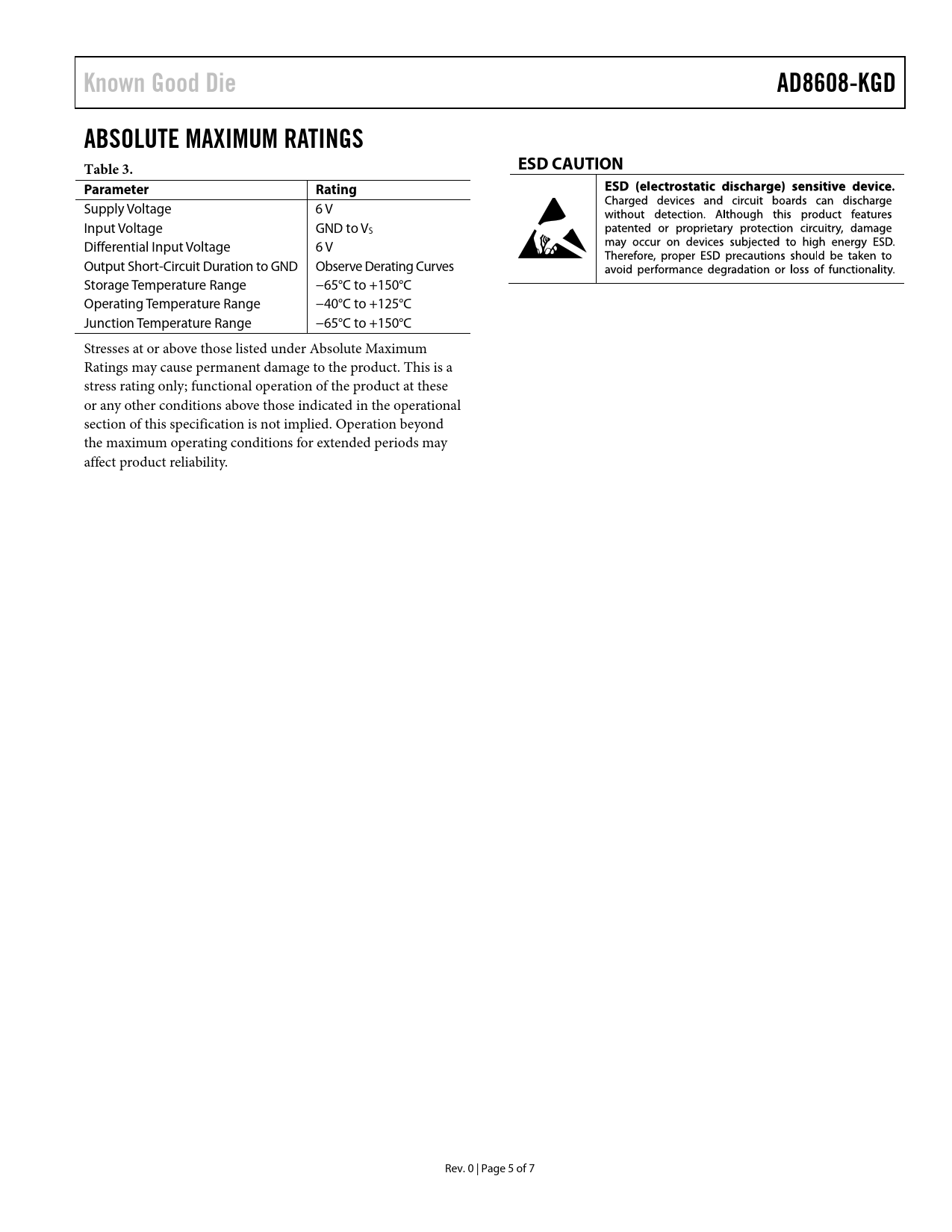 Known Good DieAD8608-KGDABSOLUTE MAXIMUM RATINGS Table 3.ESD CAUTIONParameterRating Supply Voltage 6 V Input Voltage GND to VS Differential Input Voltage 6 V Output Short-Circuit Duration to GND Observe Derating Curves Storage Temperature Range −65°C to +150°C Operating Temperature Range −40°C to +125°C Junction Temperature Range −65°C to +150°C Stresses at or above those listed under Absolute Maximum Ratings may cause permanent damage to the product. This is a stress rating only; functional operation of the product at these or any other conditions above those indicated in the operational section of this specification is not implied. Operation beyond the maximum operating conditions for extended periods may affect product reliability. Rev. 0 | Page 5 of 7 Document Outline FEATURES APPLICATIONS GENERAL DESCRIPTION TABLE OF CONTENTS REVISION HISTORY SPECIFICATIONS 5 V ELECTRICAL SPECIFICATIONS 2.7 V ELECTRICAL SPECIFICATIONS ABSOLUTE MAXIMUM RATINGS ESD CAUTION PIN CONFIGURATION AND FUNCTION DESCRIPTIONS OUTLINE DIMENSIONS DIE SPECIFICATIONS AND ASSEMBLY RECOMMENDATIONS ORDERING GUIDE