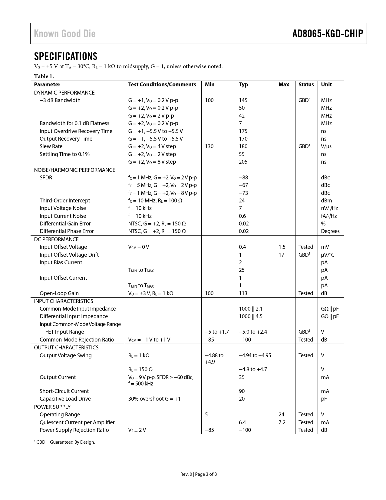 Known Good Die AD8065-KGD-CHIP SPECIFICATIONS Table 1 Parameter Test Conditions/Comments Min Typ Max Status Unit