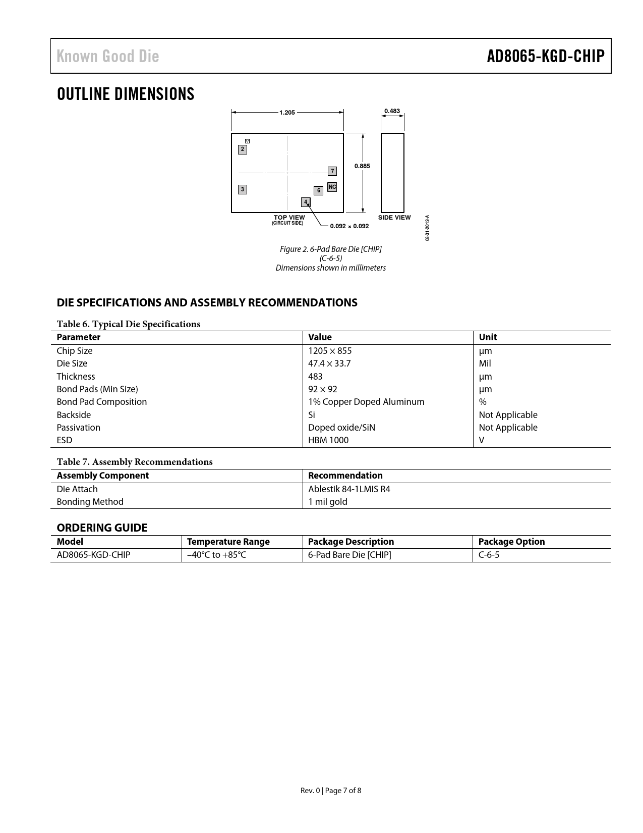 Seiten / Seite8 / 7 — Known Good Die. AD8065-KGD-CHIP. OUTLINE DIMENSIONS. 1.205. 0.483. 0.885. …