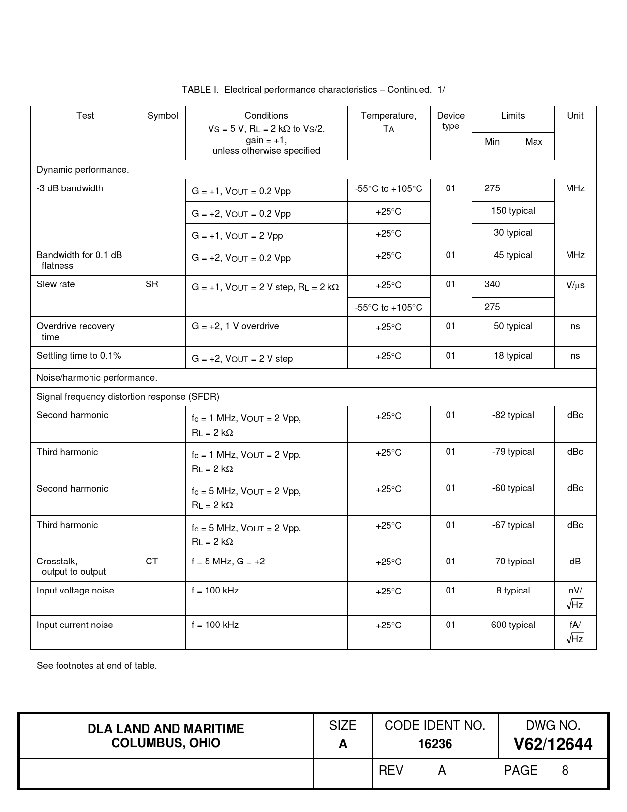TABLE I. Electrical performance characteristics – Continued. 1/ Test Symbol Conditions Temperature, Device Limits Unit VS = 5 V, RL = 2 k to VS/2, TA type gain = +1, Min Max unless otherwise specified Dynamic performance. -3 dB bandwidth G = +1, VOUT = 0.2 Vpp -55C to +105C 01 275 MHz G = +2, VOUT = 0.2 Vpp +25C 150 typical G = +1, VOUT = 2 Vpp +25C 30 typical Bandwidth for 0.1 dB G = +2, VOUT = 0.2 Vpp +25C 01 45 typical MHz flatness Slew rate SR G = +1, VOUT = 2 V step, RL = 2 k +25C 01 340 V/s -55C to +105C 275 Overdrive recovery G = +2, 1 V overdrive +25C 01 50 typical ns time Settling time to 0.1% G = +2, VOUT = 2 V step +25C 01 18 typical ns Noise/harmonic performance. Signal frequency distortion response (SFDR) Second harmonic fc = 1 MHz, VOUT = 2 Vpp, +25C 01 -82 typical dBc RL = 2 k Third harmonic fc = 1 MHz, VOUT = 2 Vpp, +25C 01 -79 typical dBc RL = 2 k Second harmonic fc = 5 MHz, VOUT = 2 Vpp, +25C 01 -60 typical dBc RL = 2 k Third harmonic fc = 5 MHz, VOUT = 2 Vpp, +25C 01 -67 typical dBc RL = 2 k Crosstalk, CT f = 5 MHz, G = +2 +25C 01 -70 typical dB output to output Input voltage noise f = 100 kHz +25C 01 8 typical nV/ Hz Input current noise f = 100 kHz +25C 01 600 typical fA/ Hz See footnotes at end of table.