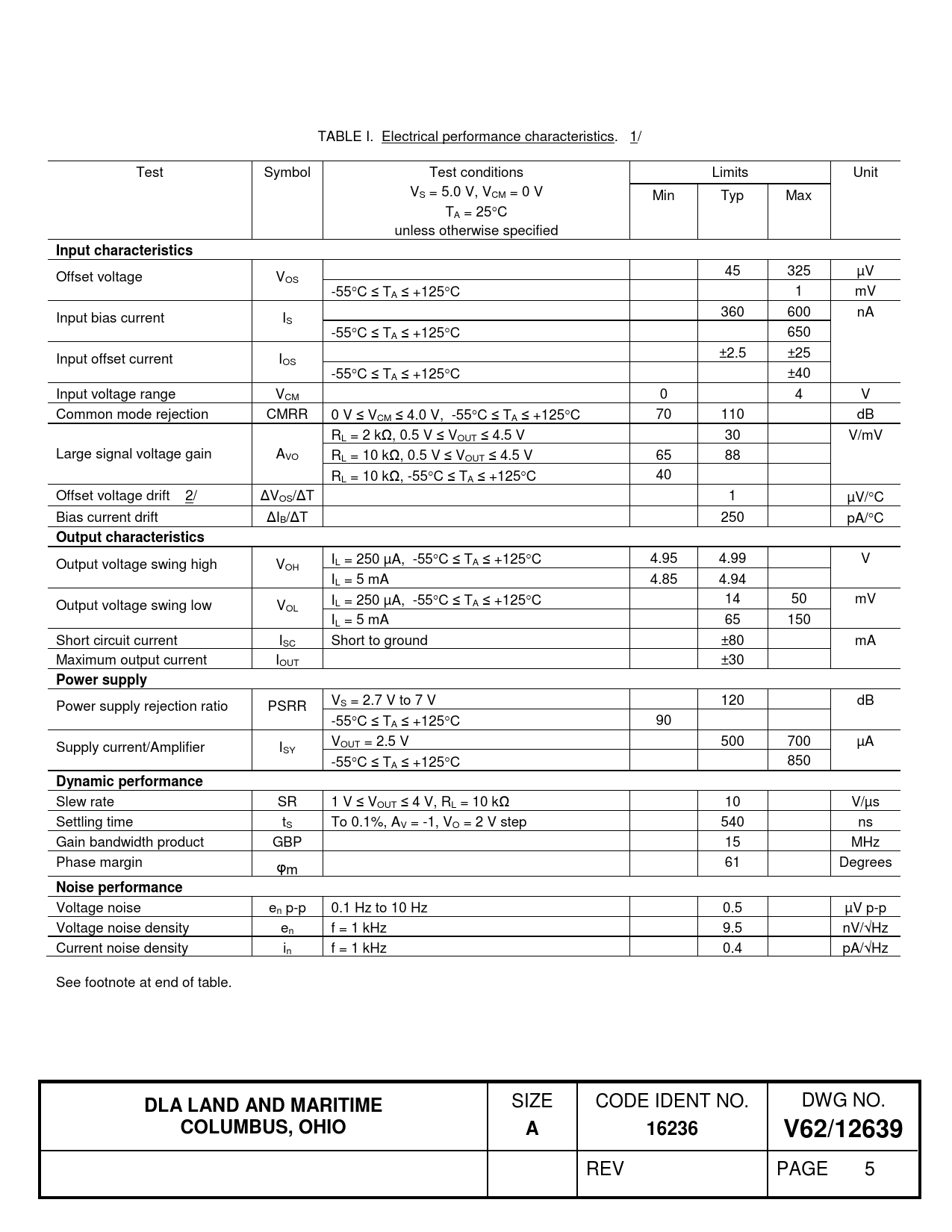Input characteristics Output characteristics Power supply Dynamic performance Noise performance DLA LAND AND MARITIME