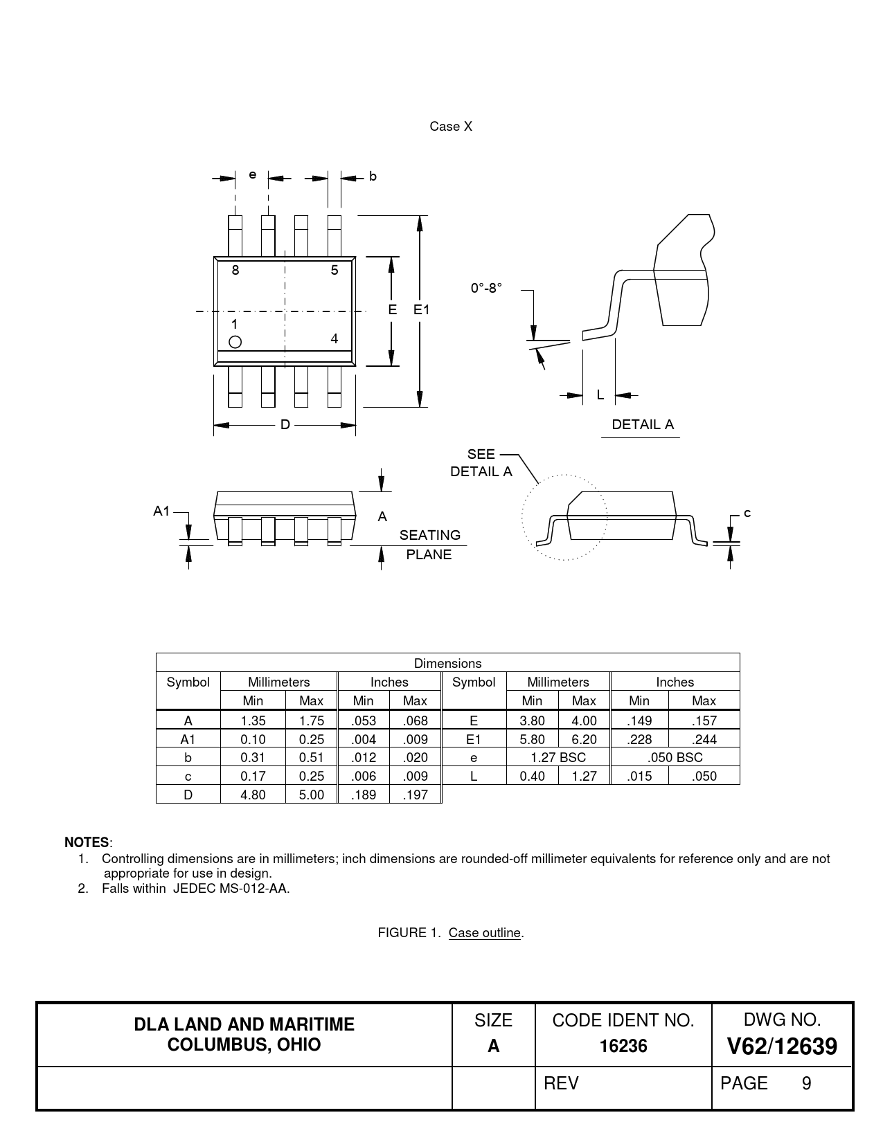 : 1. Controlling dimensions are in millimeters; inch dimensions are rounded-off millimeter equivalents for reference only and are not appropriate for use in design. 2. Falls within JEDEC MS-012-AA. FIGURE 1. Case outline.