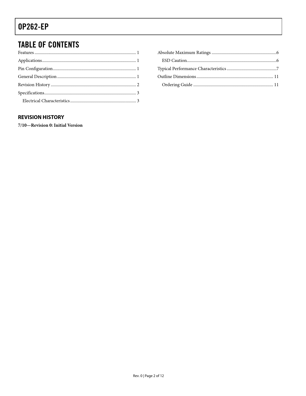 link to page 1 link to page 1 link to page 1 link to page 1 link to page 2 link to page 3 link to page 3 link to page 6 link to page 6 link to page 7 link to page 11 link to page 11 OP262-EP TABLE OF CONTENTS Features .. 1 Absolute Maximum Ratings ..6 Applications ... 1 ESD Caution...6 Pin Configuration ... 1 Typical Performance Characteristics ..7 General Description ... 1 Outline Dimensions ... 11 Revision History ... 2 Ordering Guide .. 11 Specifications ... 3 Electrical Characteristics ... 3