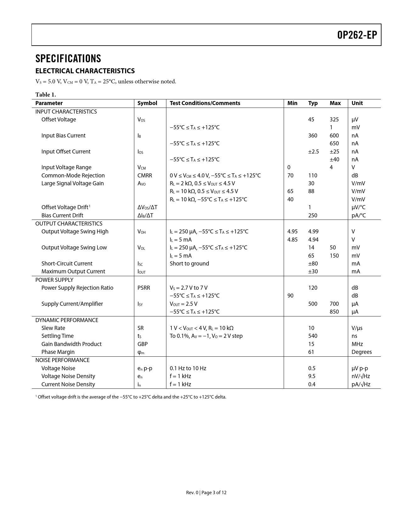 link to page 3 OP262-EP SPECIFICATIONS ELECTRICAL CHARACTERISTICS VS = 5.0 V, VCM = 0 V, TA = 25°C, unless otherwise noted. Table 1. ParameterSymbolTest Conditions/CommentsMinTypMaxUnit INPUT CHARACTERISTICS Offset Voltage VOS 45 325 μV −55°C ≤ TA ≤ +125°C 1 mV Input Bias Current IB 360 600 nA −55°C ≤ TA ≤ +125°C 650 nA Input Offset Current IOS ±2.5 ±25 nA −55°C ≤ TA ≤ +125°C ±40 nA Input Voltage Range VCM 0 4 V Common-Mode Rejection CMRR 0 V ≤ VCM ≤ 4.0 V, −55°C ≤ TA ≤ +125°C 70 110 dB Large Signal Voltage Gain AVO RL = 2 kΩ, 0.5 ≤ VOUT ≤ 4.5 V 30 V/mV RL = 10 kΩ, 0.5 ≤ VOUT ≤ 4.5 V 65 88 V/mV RL = 10 kΩ, −55°C ≤ TA ≤ +125°C 40 V/mV Offset Voltage Drift1 ΔVOS/ΔT 1 μV/°C Bias Current Drift ΔIB/ΔT 250 pA/°C OUTPUT CHARACTERISTICS Output Voltage Swing High VOH IL = 250 μA, −55°C ≤ TA ≤ +125°C 4.95 4.99 V IL = 5 mA 4.85 4.94 V Output Voltage Swing Low VOL IL = 250 μA, −55°C ≤TA ≤ +125°C 14 50 mV IL = 5 mA 65 150 mV Short-Circuit Current ISC Short to ground ±80 mA Maximum Output Current IOUT ±30 mA POWER SUPPLY Power Supply Rejection Ratio PSRR VS = 2.7 V to 7 V 120 dB −55°C ≤ TA ≤ +125°C 90 dB Supply Current/Amplifier ISY VOUT = 2.5 V 500 700 μA −55°C ≤ TA ≤ +125°C 850 μA DYNAMIC PERFORMANCE Slew Rate SR 1 V < VOUT < 4 V, RL = 10 kΩ 10 V/μs Settling Time tS To 0.1%, AV = −1, VO = 2 V step 540 ns Gain Bandwidth Product GBP 15 MHz Phase Margin φm 61 Degrees NOISE PERFORMANCE Voltage Noise en p-p 0.1 Hz to 10 Hz 0.5 μV p-p Voltage Noise Density en f = 1 kHz 9.5 nV/√Hz Current Noise Density in f = 1 kHz 0.4 pA/√Hz 1 Offset voltage drift is the average of the −55°C to +25°C delta and the +25°C to +125°C delta. Rev. 0 | Page 3 of 12 Document Outline FEATURES APPLICATIONS PIN CONFIGURATION GENERAL DESCRIPTION TABLE OF CONTENTS REVISION HISTORY SPECIFICATIONS ELECTRICAL CHARACTERISTICS ABSOLUTE MAXIMUM RATINGS ESD CAUTION TYPICAL PERFORMANCE CHARACTERISTICS OUTLINE DIMENSIONS ORDERING GUIDE