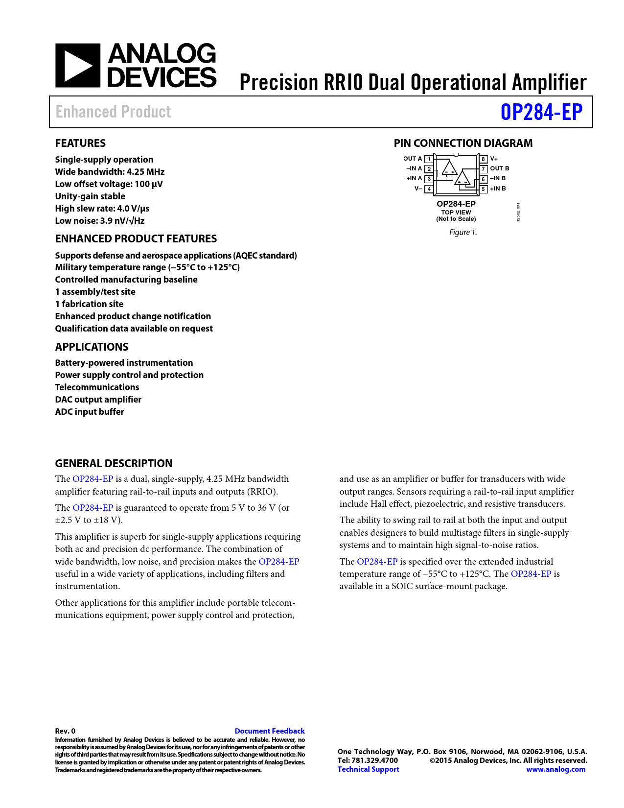The OP284-EP is a dual, single-supply, 4.25 MHz bandwidth and use as an amplifier or buffer for transducers with wide amplifier featuring rail-to-rail inputs and outputs (RRIO). output ranges. Sensors requiring a rail-to-rail input amplifier The OP284-EP is guaranteed to operate from 5 V to 36 V (or include Hal effect, piezoelectric, and resistive transducers. ±2.5 V to ±18 V). The ability to swing rail to rail at both the input and output This amplifier is superb for single-supply applications requiring enables designers to build multistage filters in single-supply both ac and precision dc performance. The combination of systems and to maintain high signal-to-noise ratios. wide bandwidth, low noise, and precision makes the OP284-EP The OP284-EP is specified over the extended industrial useful in a wide variety of applications, including filters and temperature range of −55°C to +125°C. The OP284-EP is instrumentation. available in a SOIC surface-mount package. Other applications for this amplifier include portable telecom- munications equipment, power supply control and protection,