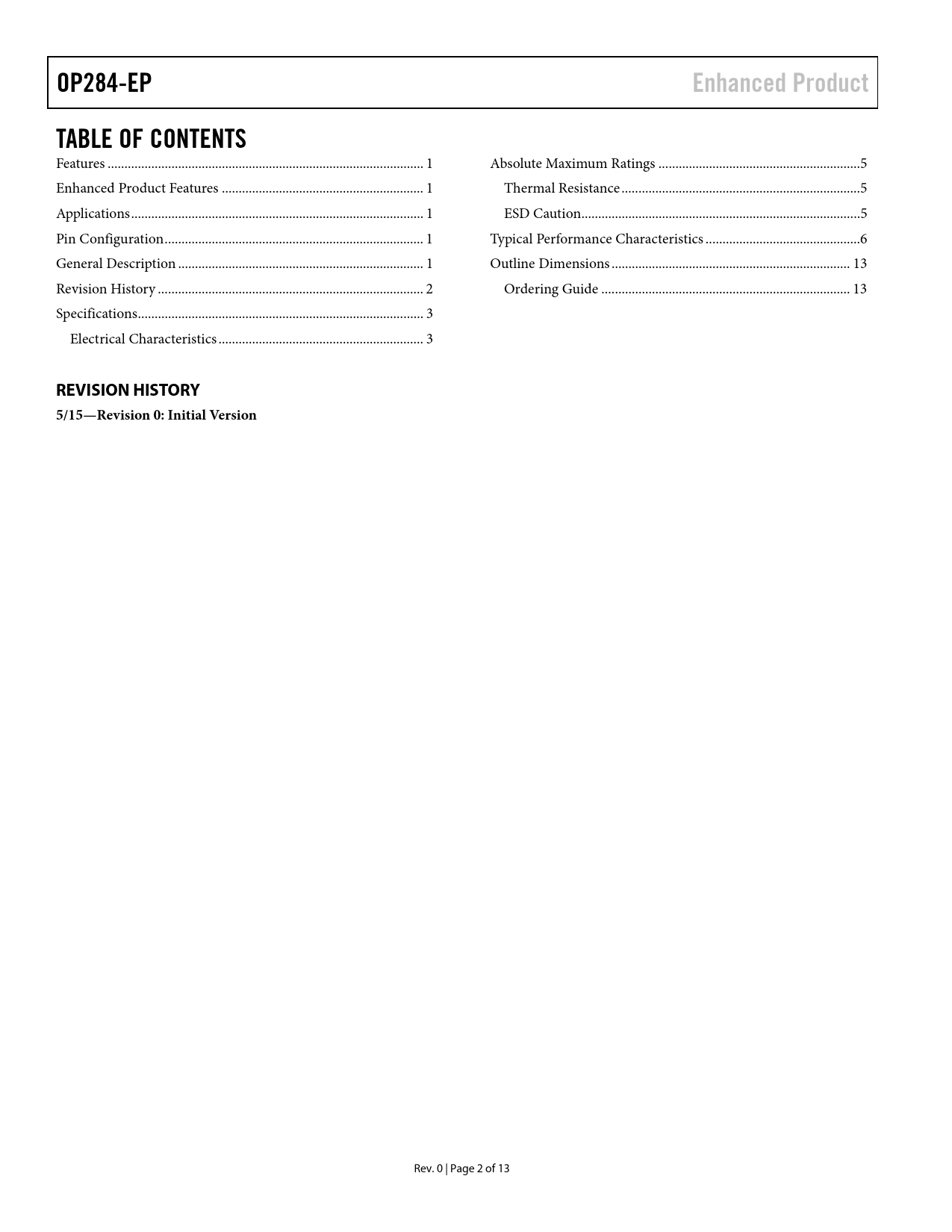 link to page 1 link to page 1 link to page 1 link to page 1 link to page 1 link to page 2 link to page 3 link to page 3 link to page 5 link to page 5 link to page 5 link to page 6 link to page 13 link to page 13 OP284-EPEnhanced ProductTABLE OF CONTENTS Features .. 1 Absolute Maximum Ratings ..5 Enhanced Product Features .. 1 Thermal Resistance ...5 Applications ... 1 ESD Caution...5 Pin Configuration ... 1 Typical Performance Characteristics ..6 General Description ... 1 Outline Dimensions ... 13 Revision History ... 2 Ordering Guide .. 13 Specifications ... 3 Electrical Characteristics ... 3 REVISION HISTORY 5/15—Revision 0: Initial Version Rev. 0 | Page 2 of 13 Document Outline FEATURES ENHANCED PRODUCT FEATURES APPLICATIONS PIN CONNECTION DIAGRAM GENERAL DESCRIPTION TABLE OF CONTENTS REVISION HISTORY SPECIFICATIONS ELECTRICAL CHARACTERISTICS ABSOLUTE MAXIMUM RATINGS THERMAL RESISTANCE ESD CAUTION PIN CONFIGURATION AND FUNCTION DESCRIPTIONS TYPICAL PERFORMANCE CHARACTERISTICS OUTLINE DIMENSIONS ORDERING GUIDE