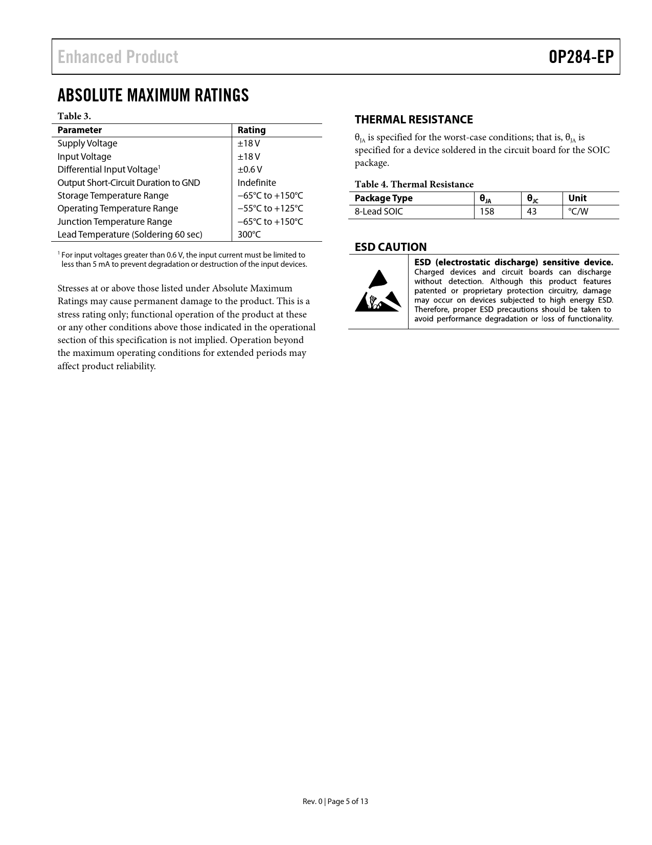 Enhanced Product. OP284-EP. ABSOLUTE MAXIMUM RATINGS. Table 3. THERMAL RESISTANCE. Parameter. Rating. Table 4. Thermal Resistance