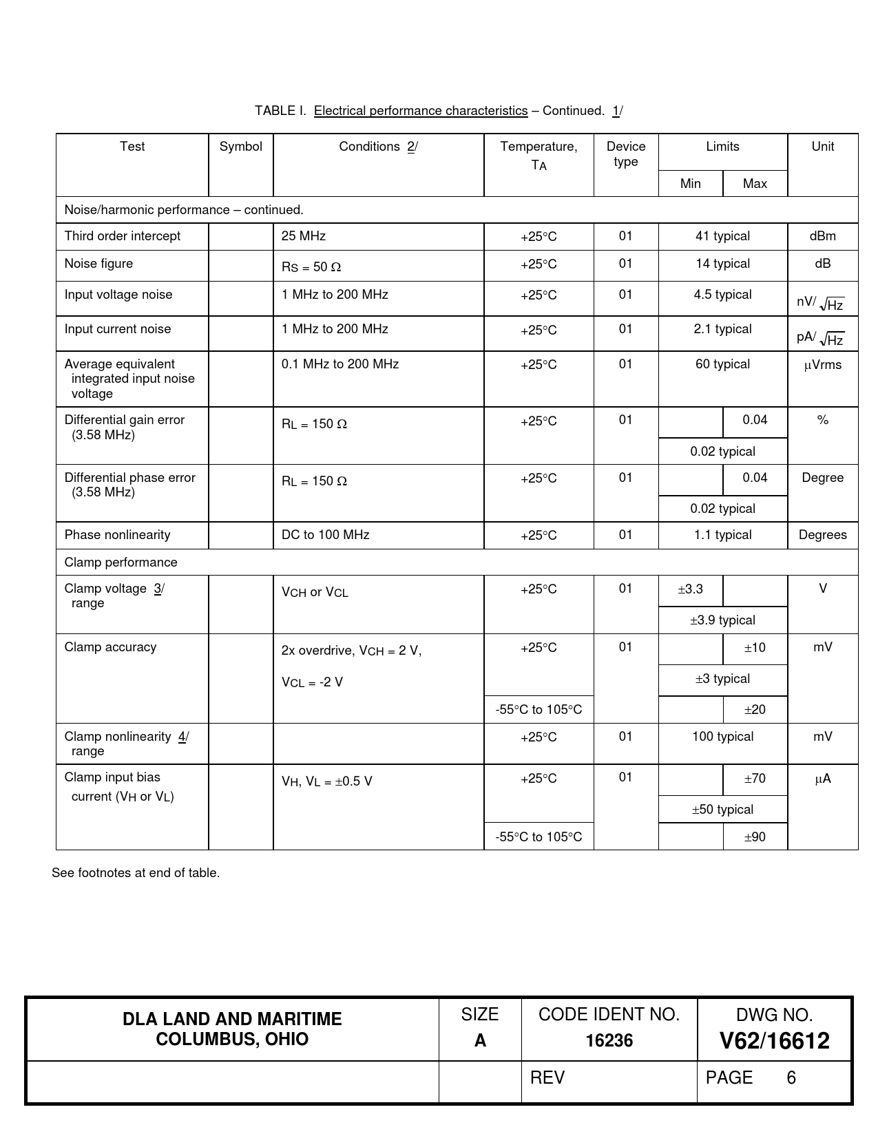 TABLE I. Electrical performance characteristics – Continued. 1/ Test Symbol Conditions 2/ Temperature, Device Limits Unit TA type Min Max Noise/harmonic performance – continued. Third order intercept 25 MHz +25C 01 41 typical dBm Noise figure RS = 50 +25C 01 14 typical dB Input voltage noise 1 MHz to 200 MHz +25C 01 4.5 typical nV/ Hz Input current noise 1 MHz to 200 MHz +25C 01 2.1 typical pA/ Hz Average equivalent 0.1 MHz to 200 MHz +25C 01 60 typical Vrms integrated input noise voltage Differential gain error RL = 150 +25C 01 0.04 % (3.58 MHz) 0.02 typical Differential phase error RL = 150 +25C 01 0.04 Degree (3.58 MHz) 0.02 typical Phase nonlinearity DC to 100 MHz +25C 01 1.1 typical Degrees Clamp performance Clamp voltage 3/ VCH or VCL +25C 01 3.3 V range 3.9 typical Clamp accuracy 2x overdrive, VCH = 2 V, +25C 01 10 mV VCL = -2 V 3 typical -55C to 105C 20 Clamp nonlinearity 4/ +25C 01 100 typical mV range Clamp input bias VH, VL = 0.5 V +25C 01 70 A current (VH or VL) 50 typical -55C to 105C 90 See footnotes at end of table.