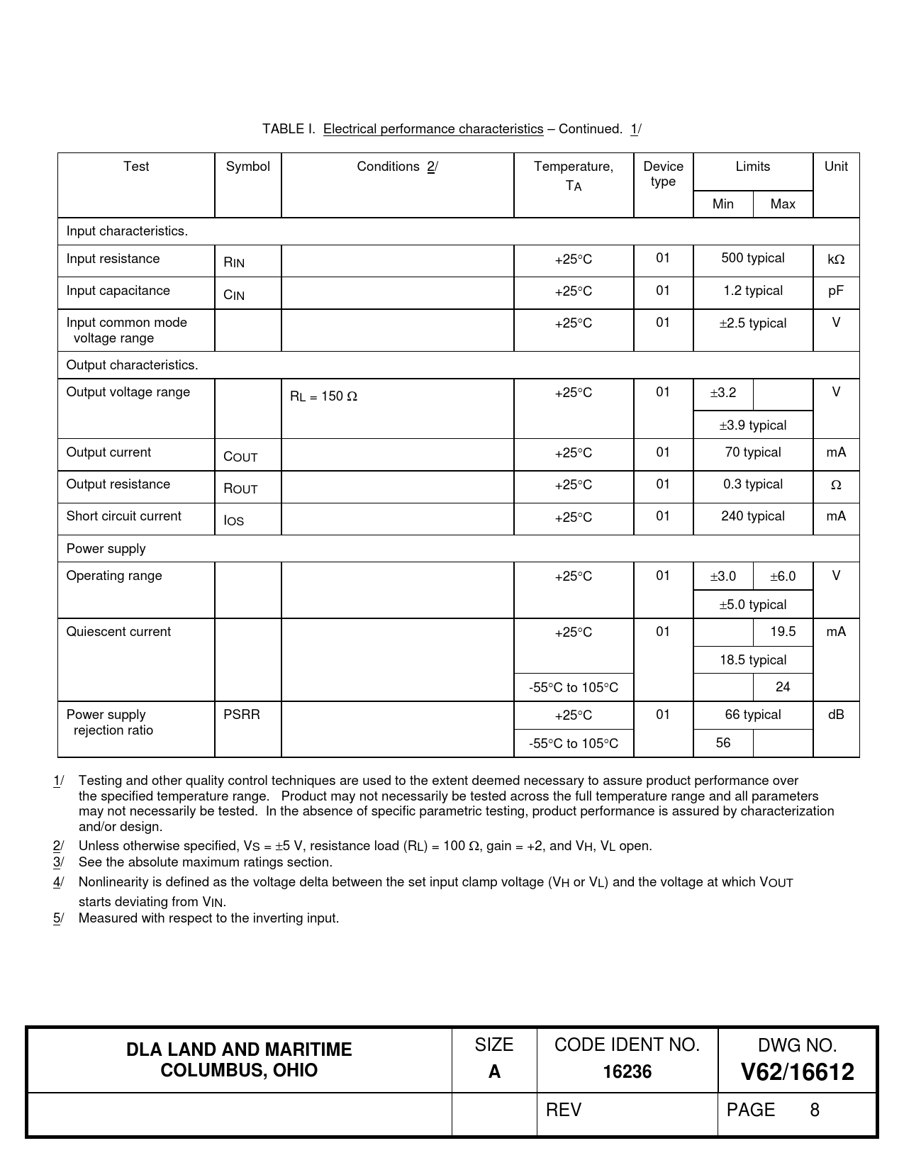 TABLE I. Electrical performance characteristics – Continued. 1/ Test Symbol Conditions 2/ Temperature, Device Limits Unit TA type Min Max Input characteristics. Input resistance RIN +25C 01 500 typical k Input capacitance CIN +25C 01 1.2 typical pF Input common mode +25C 01 2.5 typical V voltage range Output characteristics. Output voltage range RL = 150 +25C 01 3.2 V 3.9 typical Output current COUT +25C 01 70 typical mA Output resistance ROUT +25C 01 0.3 typical Short circuit current IOS +25C 01 240 typical mA Power supply Operating range +25C 01 3.0 6.0 V 5.0 typical Quiescent current +25C 01 19.5 mA 18.5 typical -55C to 105C 24 Power supply PSRR +25C 01 66 typical dB rejection ratio -55C to 105C 56 1/ Testing and other quality control techniques are used to the extent deemed necessary to assure product performance over the specified temperature range. Product may not necessarily be tested across the full temperature range and all parameters may not necessarily be tested. In the absence of specific parametric testing, product performance is assured by characterization and/or design. 2/ Unless otherwise specified, VS = 5 V, resistance load (RL) = 100 , gain = +2, and VH, VL open. 3/ See the absolute maximum ratings section. 4/ Nonlinearity is defined as the voltage delta between the set input clamp voltage (VH or VL) and the voltage at which VOUT starts deviating from VIN. 5/ Measured with respect to the inverting input.