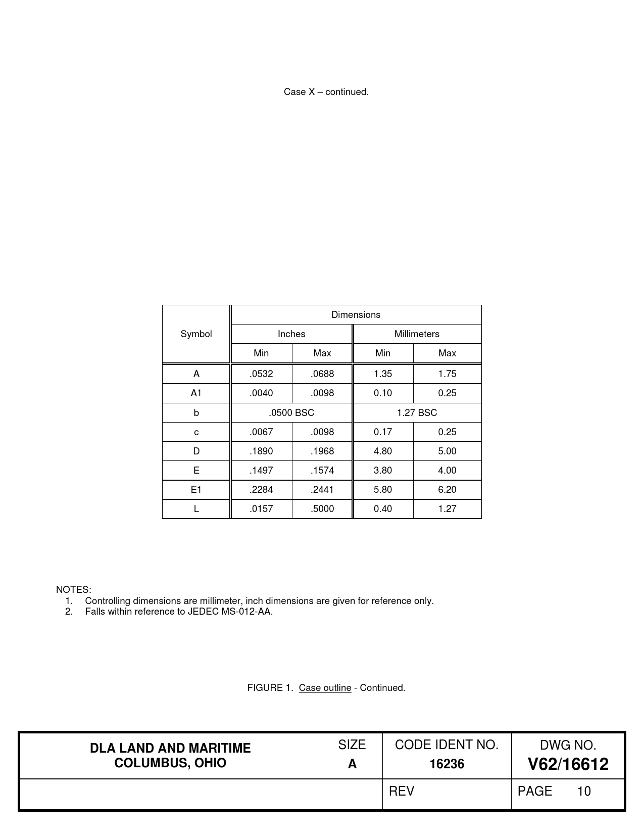 Case X – continued. Dimensions Symbol Inches Millimeters Min Max Min Max A .0532 .0688 1.35 1.75 A1 .0040 .0098 0.10 0.25 b .0500 BSC 1.27 BSC c .0067 .0098 0.17 0.25 D .1890 .1968 4.80 5.00 E .1497 .1574 3.80 4.00 E1 .2284 .2441 5.80 6.20 L .0157 .5000 0.40 1.27 NOTES: 1. Controlling dimensions are millimeter, inch dimensions are given for reference only. 2. Falls within reference to JEDEC MS-012-AA. FIGURE 1. Case outline - Continued.