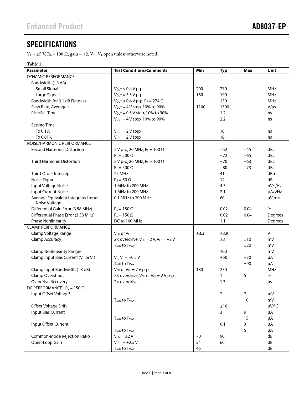 | Seiten / Seite | 8 / 3 — Enhanced Product. AD8037-EP. SPECIFICATIONS. Table 1. Parameter Test. … |
