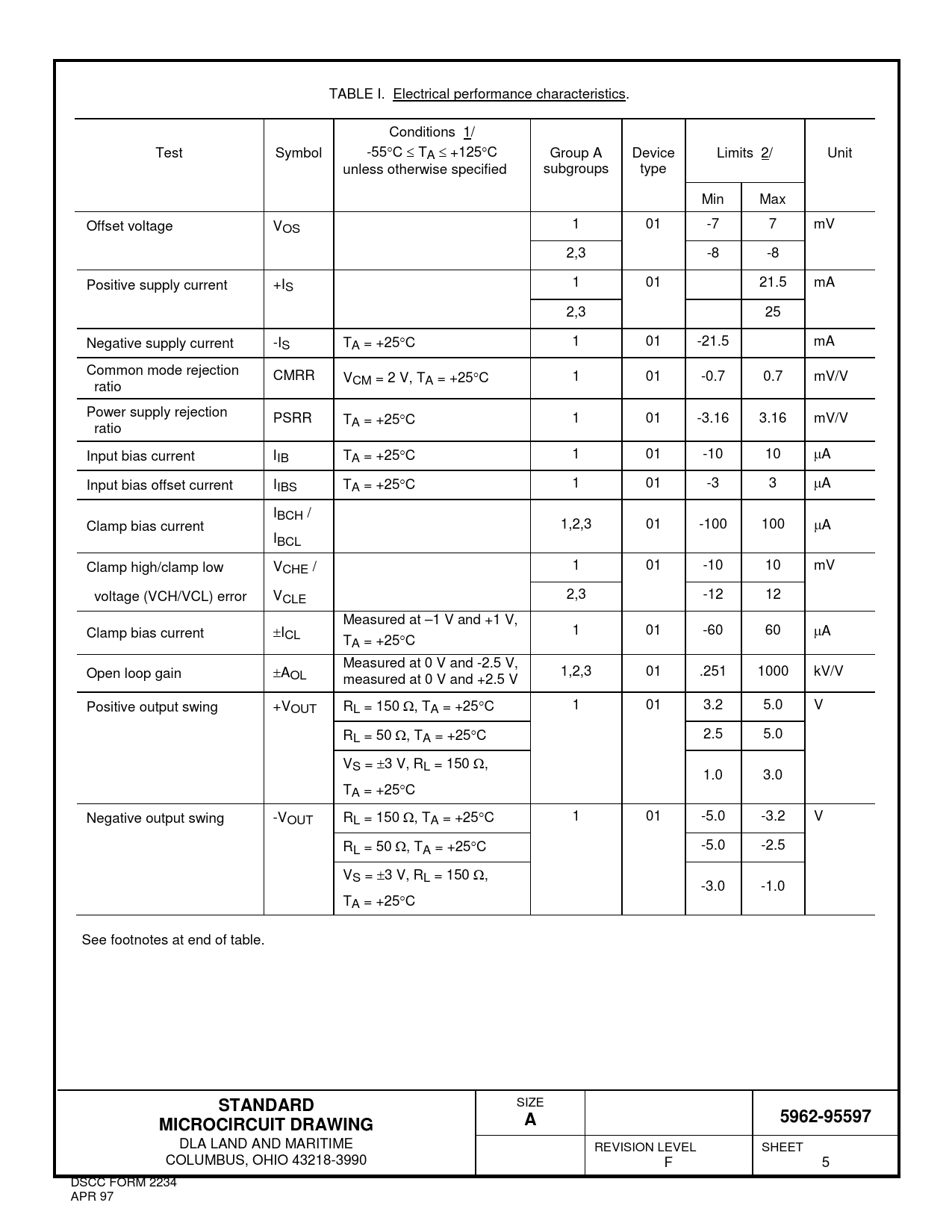 TABLE I. Electrical performance characteristics. Conditions 1/ Test Symbol -55°C ≤ TA ≤ +125°C Group A Device Limits 2/ Unit unless otherwise specified subgroups type Min Max Offset voltage VOS 1 01 -7 7 mV 2,3 -8 -8 Positive supply current +IS 1 01 21.5 mA 2,3 25 Negative supply current -IS TA = +25°C 1 01 -21.5 mA Common mode rejection CMRR V ratio CM = 2 V, TA = +25°C 1 01 -0.7 0.7 mV/V Power supply rejection PSRR T ratio A = +25°C 1 01 -3.16 3.16 mV/V Input bias current IIB TA = +25°C 1 01 -10 10 µA Input bias offset current IIBS TA = +25°C 1 01 -3 3 µA IBCH / Clamp bias current 1,2,3 01 -100 100 µA IBCL Clamp high/clamp low VCHE / 1 01 -10 10 mV voltage (VCH/VCL) error VCLE 2,3 -12 12 Measured at –1 V and +1 V, Clamp bias current ±ICL 1 01 -60 60 µA TA = +25°C Measured at 0 V and -2.5 V, Open loop gain ±AOL 1,2,3 01 .251 1000 kV/V measured at 0 V and +2.5 V Positive output swing +VOUT RL = 150 Ω, TA = +25°C 1 01 3.2 5.0 V RL = 50 Ω, TA = +25°C 2.5 5.0 VS = ±3 V, RL = 150 Ω, 1.0 3.0 TA = +25°C Negative output swing -VOUT RL = 150 Ω, TA = +25°C 1 01 -5.0 -3.2 V RL = 50 Ω, TA = +25°C -5.0 -2.5 VS = ±3 V, RL = 150 Ω, -3.0 -1.0 TA = +25°C See footnotes at end of table.