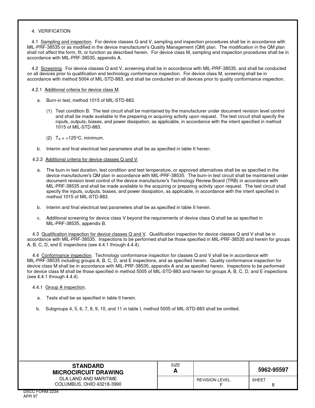 4. VERIFICATION 4.1 Sampling and inspection. For device classes Q and V, sampling and inspection procedures shall be in accordance with MIL-PRF-38535 or as modified in the device manufacturer's Quality Management (QM) plan. The modification in the QM plan shall not affect the form, fit, or function as described herein. For device class M, sampling and inspection procedures shall be in accordance with MIL-PRF-38535, appendix A. 4.2 Screening. For device classes Q and V, screening shall be in accordance with MIL-PRF-38535, and shall be conducted on all devices prior to qualification and technology conformance inspection. For device class M, screening shall be in accordance with method 5004 of MIL-STD-883, and shall be conducted on all devices prior to quality conformance inspection. 4.2.1 Additional criteria for device class M. a. Burn-in test, method 1015 of MIL-STD-883. (1) Test condition B. The test circuit shall be maintained by the manufacturer under document revision level control and shall be made available to the preparing or acquiring activity upon request. The test circuit shall specify the inputs, outputs, biases, and power dissipation, as applicable, in accordance with the intent specified in method 1015 of MIL-STD-883. (2) TA = +125°C, minimum. b. Interim and final electrical test parameters shall be as specified in table II herein. 4.2.2 Additional criteria for device classes Q and V. a. The burn-in test duration, test condition and test temperature, or approved alternatives shall be as specified in the device manufacturer's QM plan in accordance with MIL-PRF-38535. The burn-in test circuit shall be maintained under document revision level control of the device manufacturer's Technology Review Board (TRB) in accordance with MIL-PRF-38535 and shall be made available to the acquiring or preparing activity upon request. The test circuit shall specify the inputs, outputs, biases, and power dissipation, as applicable, in accordance with the intent specified in method 1015 of MIL-STD-883. b. Interim and final electrical test parameters shall be as specified in table II herein. c. Additional screening for device class V beyond the requirements of device class Q shall be as specified in MIL-PRF-38535, appendix B. 4.3 Qualification inspection for device classes Q and V. Qualification inspection for device classes Q and V shall be in accordance with MIL-PRF-38535. Inspections to be performed shall be those specified in MIL-PRF-38535 and herein for groups A, B, C, D, and E inspections (see 4.4.1 through 4.4.4). 4.4 Conformance inspection. Technology conformance inspection for classes Q and V shall be in accordance with MIL-PRF-38535 including groups A, B, C, D, and E inspections, and as specified herein. Quality conformance inspection for device class M shall be in accordance with MIL-PRF-38535, appendix A and as specified herein. Inspections to be performed for device class M shall be those specified in method 5005 of MIL-STD-883 and herein for groups A, B, C, D, and E inspections (see 4.4.1 through 4.4.4). 4.4.1 Group A inspection. a. Tests shall be as specified in table II herein. b. Subgroups 4, 5, 6, 7, 8, 9, 10, and 11 in table I, method 5005 of MIL-STD-883 shall be omitted.