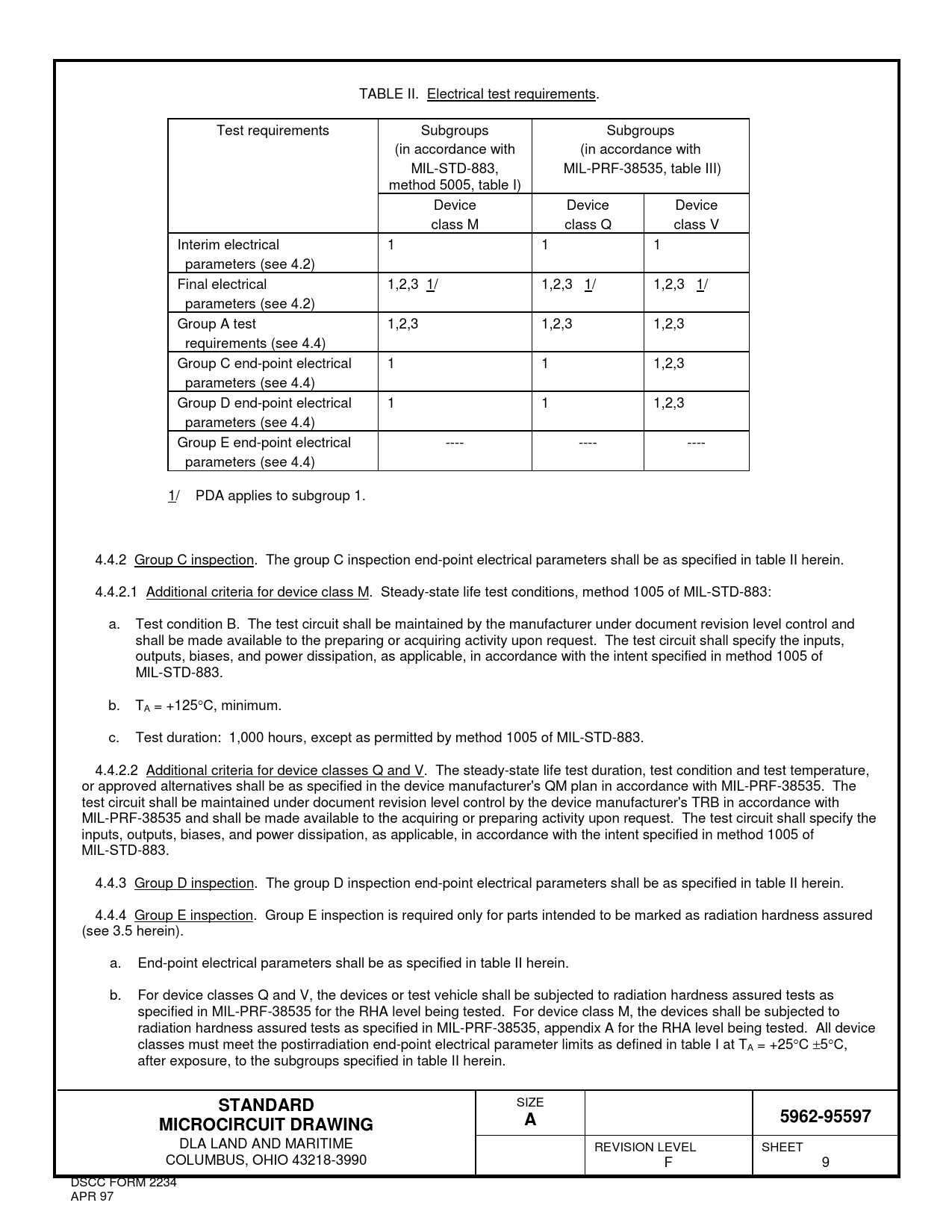 TABLE II. Electrical test requirements. Test requirements Subgroups Subgroups (in accordance with (in accordance with MIL-STD-883, MIL-PRF-38535, table III) method 5005, table I) Device Device Device class M class Q class V Interim electrical 1 1 1 parameters (see 4.2) Final electrical 1,2,3 1/ 1,2,3 1/ 1,2,3 1/ parameters (see 4.2) Group A test 1,2,3 1,2,3 1,2,3 requirements (see 4.4) Group C end-point electrical 1 1 1,2,3 parameters (see 4.4) Group D end-point electrical 1 1 1,2,3 parameters (see 4.4) Group E end-point electrical ---- ---- ---- parameters (see 4.4) 1/ PDA applies to subgroup 1. 4.4.2 Group C inspection. The group C inspection end-point electrical parameters shall be as specified in table II herein. 4.4.2.1 Additional criteria for device class M. Steady-state life test conditions, method 1005 of MIL-STD-883: a. Test condition B. The test circuit shall be maintained by the manufacturer under document revision level control and shall be made available to the preparing or acquiring activity upon request. The test circuit shall specify the inputs, outputs, biases, and power dissipation, as applicable, in accordance with the intent specified in method 1005 of MIL-STD-883. b. TA = +125°C, minimum. c. Test duration: 1,000 hours, except as permitted by method 1005 of MIL-STD-883. 4.4.2.2 Additional criteria for device classes Q and V. The steady-state life test duration, test condition and test temperature, or approved alternatives shall be as specified in the device manufacturer's QM plan in accordance with MIL-PRF-38535. The test circuit shall be maintained under document revision level control by the device manufacturer's TRB in accordance with MIL-PRF-38535 and shall be made available to the acquiring or preparing activity upon request. The test circuit shall specify the inputs, outputs, biases, and power dissipation, as applicable, in accordance with the intent specified in method 1005 of MIL-STD-883. 4.4.3 Group D inspection. The group D inspection end-point electrical parameters shall be as specified in table II herein. 4.4.4 Group E inspection. Group E inspection is required only for parts intended to be marked as radiation hardness assured (see 3.5 herein). a. End-point electrical parameters shall be as specified in table II herein. b. For device classes Q and V, the devices or test vehicle shall be subjected to radiation hardness assured tests as specified in MIL-PRF-38535 for the RHA level being tested. For device class M, the devices shall be subjected to radiation hardness assured tests as specified in MIL-PRF-38535, appendix A for the RHA level being tested. All device classes must meet the postirradiation end-point electrical parameter limits as defined in table I at TA = +25°C ±5°C, after exposure, to the subgroups specified in table II herein. STANDARD SIZE 5962-95597MICROCIRCUIT DRAWINGA DLA LAND AND MARITIME REVISION LEVEL SHEET COLUMBUS, OHIO 43218-3990 F 9 DSCC FORM 2234 APR 97 Document Outline DEPARTMENT OF DEFENSE SPECIFICATION DEPARTMENT OF DEFENSE STANDARDS