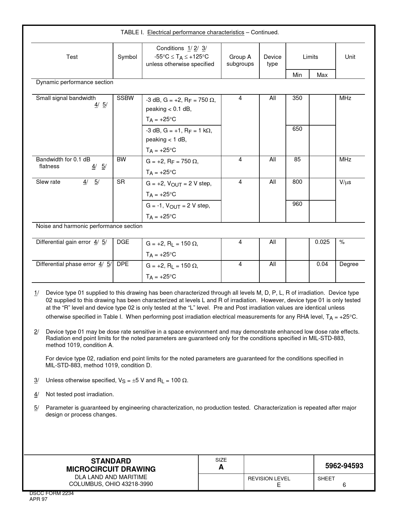 TABLE I. Electrical performance characteristics – Continued. Conditions 1/ 2/ 3/ Test Symbol -55°C ≤ TA ≤ +125°C Group A Device Limits Unit unless otherwise specified subgroups type Min Max Dynamic performance section Small signal bandwidth SSBW -3 dB, G = +2, R 4 All 350 MHz F = 750 Ω, 4/ 5/ peaking < 0.1 dB, TA = +25°C -3 dB, G = +1, R 650 F = 1 kΩ, peaking < 1 dB, TA = +25°C Bandwidth for 0.1 dB BW G = +2, R 4 All 85 MHz F = 750 Ω, flatness 4/ 5/ TA = +25°C Slew rate 4/ 5/ SR G = +2, V 4 All 800 V/µs OUT = 2 V step, TA = +25°C G = -1, V 960 OUT = 2 V step, TA = +25°C Noise and harmonic performance section Differential gain error 4/ 5/ DGE G = +2, R 4 All 0.025 % L = 150 Ω, TA = +25°C Differential phase error 4/ 5/ DPE G = +2, R 4 All 0.04 Degree L = 150 Ω, TA = +25°C 1/ Device type 01 supplied to this drawing has been characterized through all levels M, D, P, L, R of irradiation. Device type 02 supplied to this drawing has been characterized at levels L and R of irradiation. However, device type 01 is only tested at the “R” level and device type 02 is only tested at the “L” level. Pre and Post irradiation values are identical unless otherwise specified in Table I. When performing post irradiation electrical measurements for any RHA level, TA = +25°C. 2/ Device type 01 may be dose rate sensitive in a space environment and may demonstrate enhanced low dose rate effects. Radiation end point limits for the noted parameters are guaranteed only for the conditions specified in MIL-STD-883, method 1019, condition A. For device type 02, radiation end point limits for the noted parameters are guaranteed for the conditions specified in MIL-STD-883, method 1019, condition D. 3/ Unless otherwise specified, VS = ±5 V and RL = 100 Ω. 4/ Not tested post irradiation. 5/ Parameter is guaranteed by engineering characterization, no production tested. Characterization is repeated after major design or process changes. STANDARD SIZE 5962-94593MICROCIRCUIT DRAWINGA DLA LAND AND MARITIME REVISION LEVEL SHEET COLUMBUS, OHIO 43218-3990 E 6 DSCC FORM 2234 APR 97 Document Outline DEPARTMENT OF DEFENSE SPECIFICATION DEPARTMENT OF DEFENSE STANDARDS