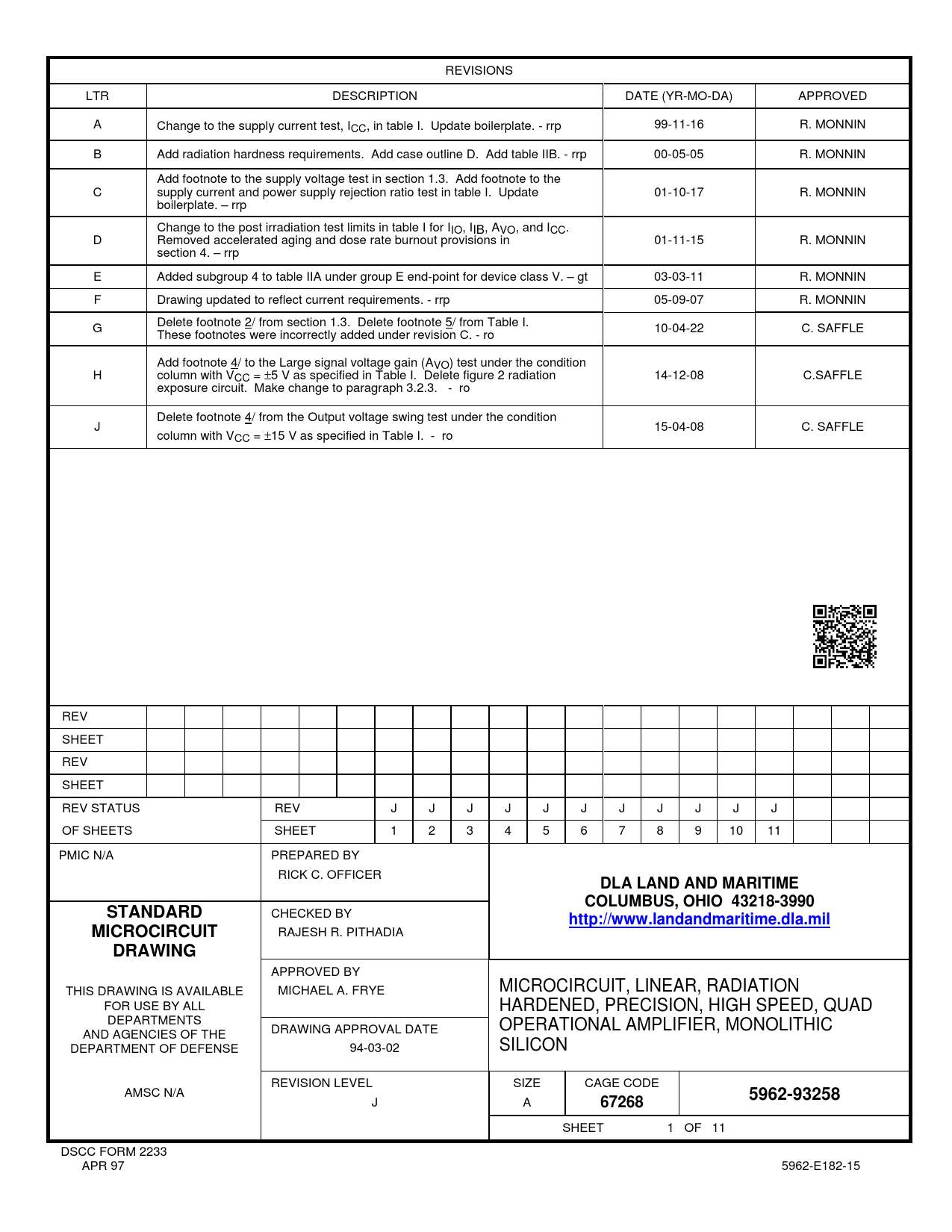 SHEET 1 OF 11 DSCC FORM 2233 APR 97 5962-E182-15