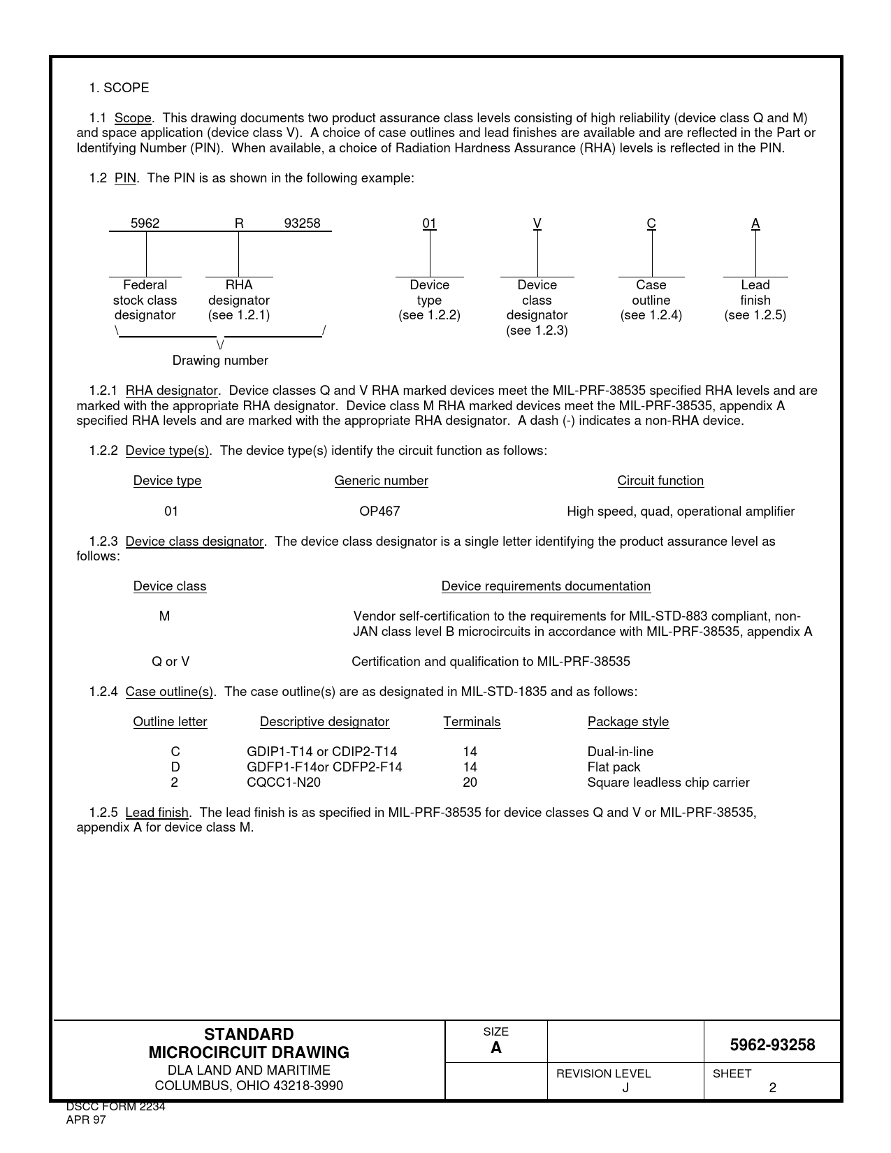 1. SCOPE 1.1 Scope. This drawing documents two product assurance class levels consisting of high reliability (device class Q and M) and space application (device class V). A choice of case outlines and lead finishes are available and are reflected in the Part or Identifying Number (PIN). When available, a choice of Radiation Hardness Assurance (RHA) levels is reflected in the PIN. 1.2 PIN. The PIN is as shown in the following example: 5962 R 93258 01 V C A Federal RHA Device Device Case Lead stock class designator type class outline finish designator (see 1.2.1) (see 1.2.2) designator (see 1.2.4) (see 1.2.5) \ / (see 1.2.3) \/ Drawing number 1.2.1 RHA designator. Device classes Q and V RHA marked devices meet the MIL-PRF-38535 specified RHA levels and are marked with the appropriate RHA designator. Device class M RHA marked devices meet the MIL-PRF-38535, appendix A specified RHA levels and are marked with the appropriate RHA designator. A dash (-) indicates a non-RHA device. 1.2.2 Device type(s). The device type(s) identify the circuit function as follows: Device type Generic number Circuit function 01 OP467 High speed, quad, operational amplifier 1.2.3 Device class designator. The device class designator is a single letter identifying the product assurance level as follows: Device class Device requirements documentation M Vendor self-certification to the requirements for MIL-STD-883 compliant, non- JAN class level B microcircuits in accordance with MIL-PRF-38535, appendix A Q or V Certification and qualification to MIL-PRF-38535 1.2.4 Case outline(s). The case outline(s) are as designated in MIL-STD-1835 and as follows: Outline letter Descriptive designator Terminals Package style C GDIP1-T14 or CDIP2-T14 14 Dual-in-line D GDFP1-F14or CDFP2-F14 14 Flat pack 2 CQCC1-N20 20 Square leadless chip carrier 1.2.5 Lead finish. The lead finish is as specified in MIL-PRF-38535 for device classes Q and V or MIL-PRF-38535, appendix A for device class M.