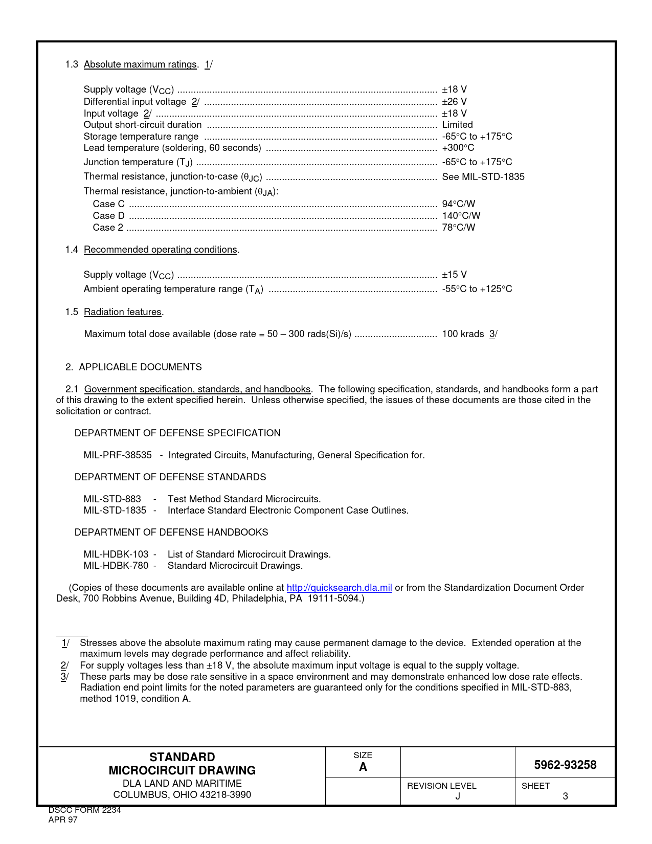 1.3 Absolute maximum ratings. 1/ Supply voltage (VCC) ... 18 V Differential input voltage 2/ ... 26 V Input voltage 2/ ... 18 V Output short-circuit duration .. Limited Storage temperature range ... -65C to +175C Lead temperature (soldering, 60 seconds) .. +300C Junction temperature (TJ) .. -65C to +175C Thermal resistance, junction-to-case (JC) .. See MIL-STD-1835 Thermal resistance, junction-to-ambient (JA): Case C ... 94C/W Case D ... 140C/W Case 2 .. 78C/W 1.4 Recommended operating conditions. Supply voltage (VCC) ... 15 V Ambient operating temperature range (TA) ... -55C to +125C 1.5 Radiation features. Maximum total dose available (dose rate = 50 – 300 rads(Si)/s) ... 100 krads 3/ 2. APPLICABLE DOCUMENTS 2.1 Government specification, standards, and handbooks. The following specification, standards, and handbooks form a part of this drawing to the extent specified herein. Unless otherwise specified, the issues of these documents are those cited in the solicitation or contract. DEPARTMENT OF DEFENSE SPECIFICATION MIL-PRF-38535 - Integrated Circuits, Manufacturing, General Specification for. DEPARTMENT OF DEFENSE STANDARDS MIL-STD-883 - Test Method Standard Microcircuits. MIL-STD-1835 - Interface Standard Electronic Component Case Outlines. DEPARTMENT OF DEFENSE HANDBOOKS MIL-HDBK-103 - List of Standard Microcircuit Drawings. MIL-HDBK-780 - Standard Microcircuit Drawings. (Copies of these documents are available online at http://quicksearch.dla.mil or from the Standardization Document Order Desk, 700 Robbins Avenue, Building 4D, Philadelphia, PA 19111-5094.) ______ 1/ Stresses above the absolute maximum rating may cause permanent damage to the device. Extended operation at the maximum levels may degrade performance and affect reliability. 2/ For supply voltages less than 18 V, the absolute maximum input voltage is equal to the supply voltage. 3/ These parts may be dose rate sensitive in a space environment and may demonstrate enhanced low dose rate effects. Radiation end point limits for the noted parameters are guaranteed only for the conditions specified in MIL-STD-883, method 1019, condition A.