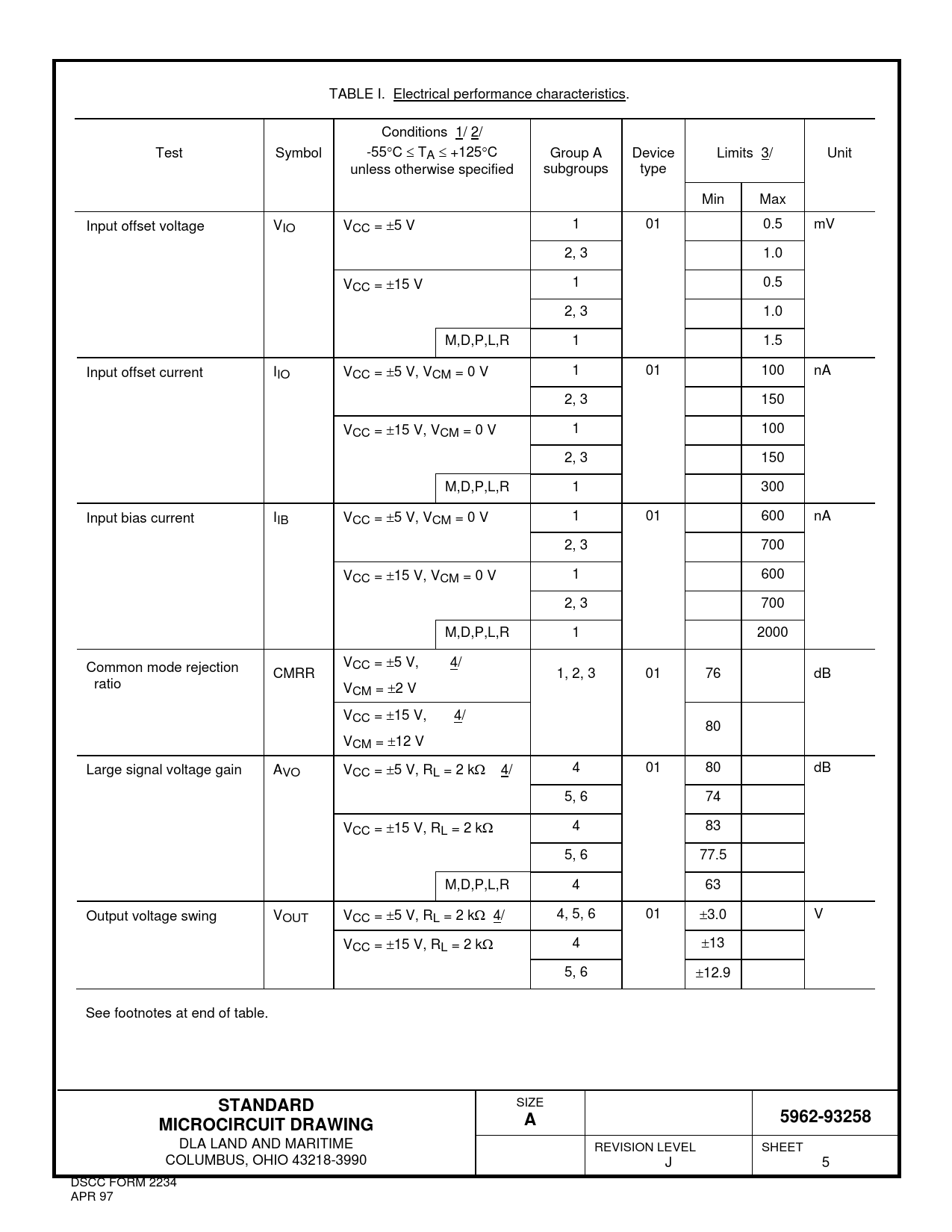 TABLE I. Electrical performance characteristics. Conditions 1/ 2/ Test Symbol -55C TA +125C Group A Device Limits 3/ Unit unless otherwise specified subgroups type Min Max Input offset voltage VIO VCC = 5 V 1 01 0.5 mV 2, 3 1.0 VCC = 15 V 1 0.5 2, 3 1.0 M,D,P,L,R 1 1.5 Input offset current IIO VCC = 5 V, VCM = 0 V 1 01 100 nA 2, 3 150 VCC = 15 V, VCM = 0 V 1 100 2, 3 150 M,D,P,L,R 1 300 Input bias current IIB VCC = 5 V, VCM = 0 V 1 01 600 nA 2, 3 700 VCC = 15 V, VCM = 0 V 1 600 2, 3 700 M,D,P,L,R 1 2000 Common mode rejection VCC = 5 V, 4/ CMRR 1, 2, 3 01 76 dB ratio VCM = 2 V VCC = 15 V, 4/ 80 VCM = 12 V Large signal voltage gain AVO VCC = 5 V, RL = 2 k 4/ 4 01 80 dB 5, 6 74 VCC = 15 V, RL = 2 k 4 83 5, 6 77.5 M,D,P,L,R 4 63 Output voltage swing VOUT VCC = 5 V, RL = 2 k 4/ 4, 5, 6 01 3.0 V VCC = 15 V, RL = 2 k 4 13 5, 6 12.9 See footnotes at end of table.