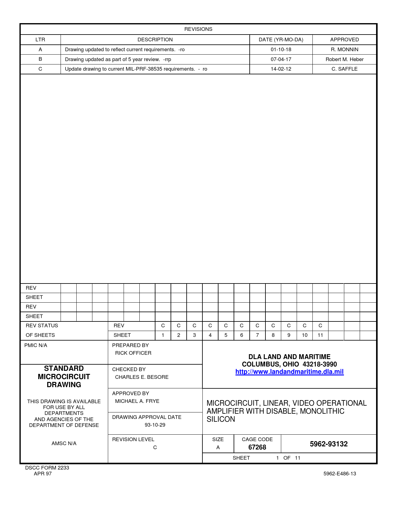 REVISIONS LTR DESCRIPTION DATE (YR-MO-DA) APPROVED A Drawing updated to reflect current requirements. -ro 01-10-18 R. MONNIN B Drawing updated as part of 5 year review. -rrp 07-04-17 Robert M. Heber C Update drawing to current MIL-PRF-38535 requirements. - ro 14-02-12 C. SAFFLE REV SHEET REV SHEET REV STATUS REV C C C C C C C C C C C OF SHEETS SHEET 1 2 3 4 5 6 7 8 9 10 11 PMIC N/A PREPARED BY RICK OFFICER DLA LAND AND MARITIMECOLUMBUS, OHIO 43218-3990STANDARD CHECKED BY http://www.landandmaritime.dla.milMICROCIRCUIT CHARLES E. BESORE DRAWING APPROVED BY THIS DRAWING IS AVAILABLE MICHAEL A. FRYE MICROCIRCUIT, LINEAR, VIDEO OPERATIONAL FOR USE BY ALL DEPARTMENTS AMPLIFIER WITH DISABLE, MONOLITHIC AND AGENCIES OF THE DRAWING APPROVAL DATE SILICON DEPARTMENT OF DEFENSE 93-10-29 REVISION LEVEL SIZE CAGE CODE AMSC N/A 5962-93132 C A 67268 SHEET 1 OF 11 DSCC FORM 2233 APR 97 5962-E486-13 Document Outline DEPARTMENT OF DEFENSE SPECIFICATION DEPARTMENT OF DEFENSE STANDARDS